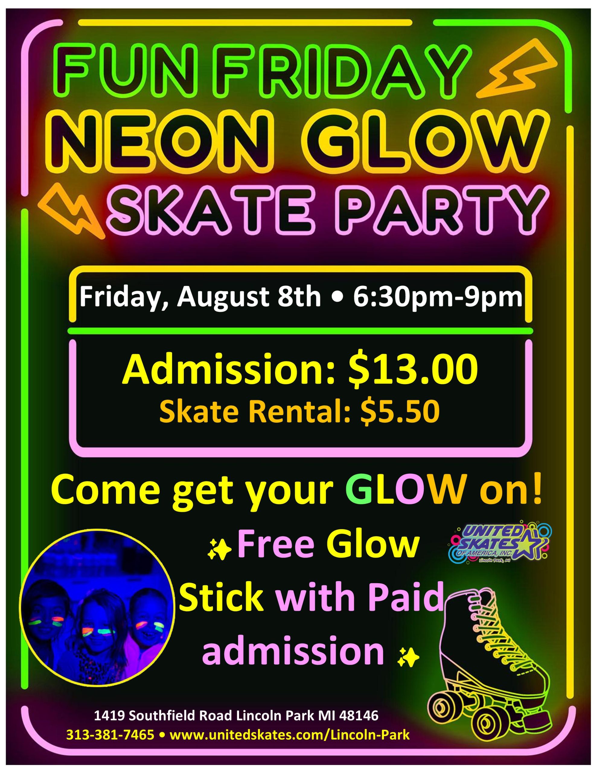 🌟🛼 Neon Friday is Back! 🛼🌟 Get ready to light up the night at our epic Glow-in-the-Dark Skate Party! Join us for Neon Friday, August 8th 6:30pm-9:00pm, where the lights go down and the glow turns up. Skate under black lights, jam to the hottest tracks, and shine all night long! Admission $13.00 Skate Rental $5.50 🎉 Special Bonus:💫 Get a FREE glow […] |