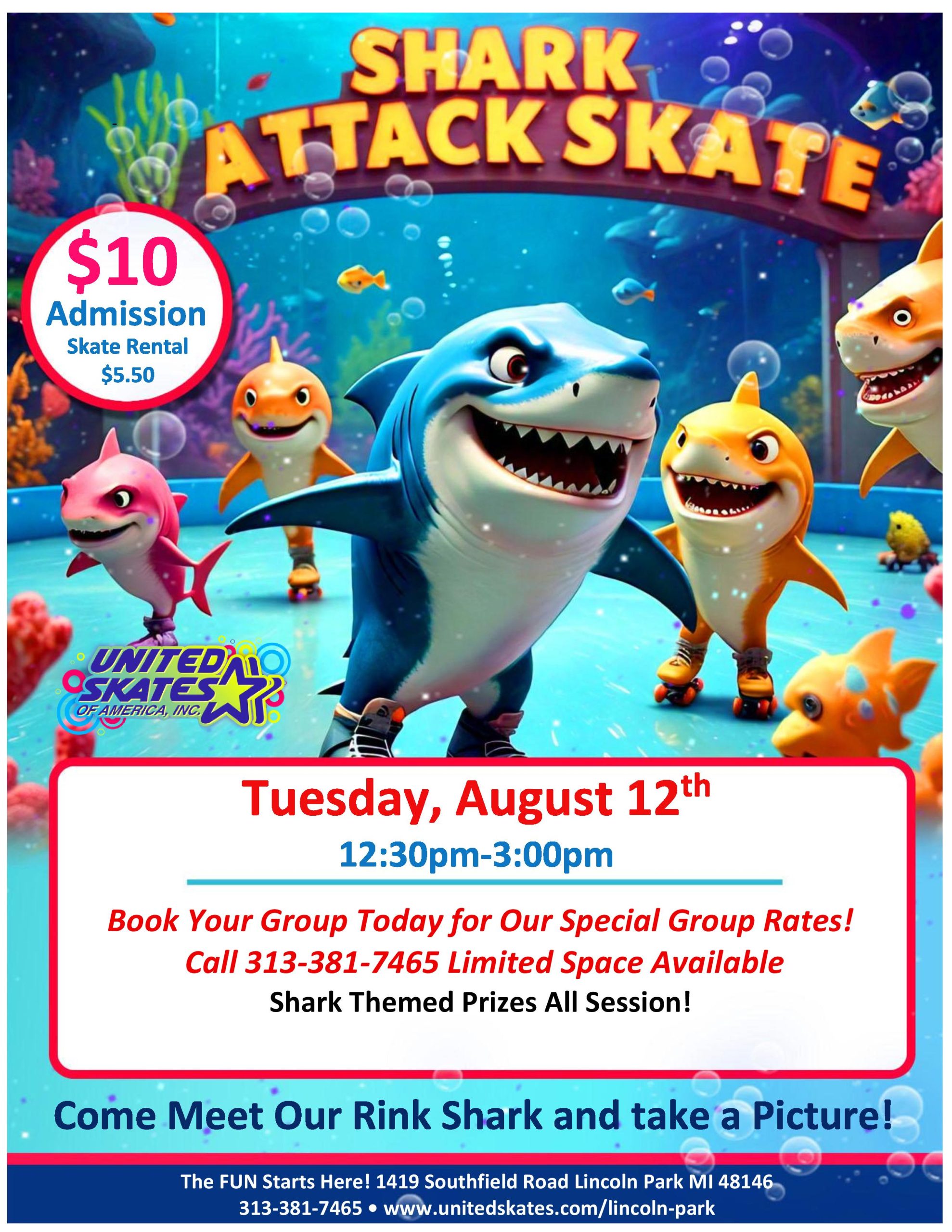 Brace yourself for Jabber Jaws! Dive into a thrilling day filled with excitement as you skate with a shark! Get a chance to win shark themed prizes all session! Tuesday, August 12th 12:30pm-3:00pm Admission $10.00 Skate Rental $5.50 Book your daycare, YMCA, Summer Camp etc. Call our Sales Team 313-381-7465
