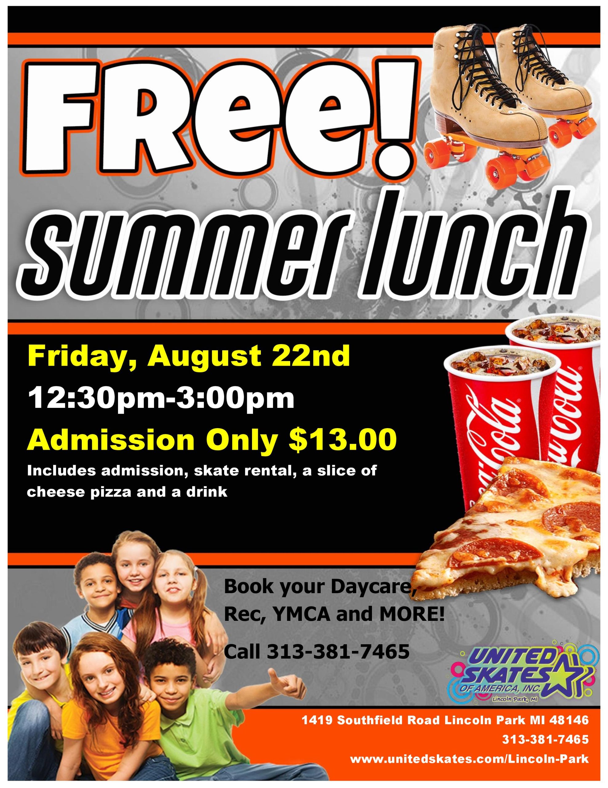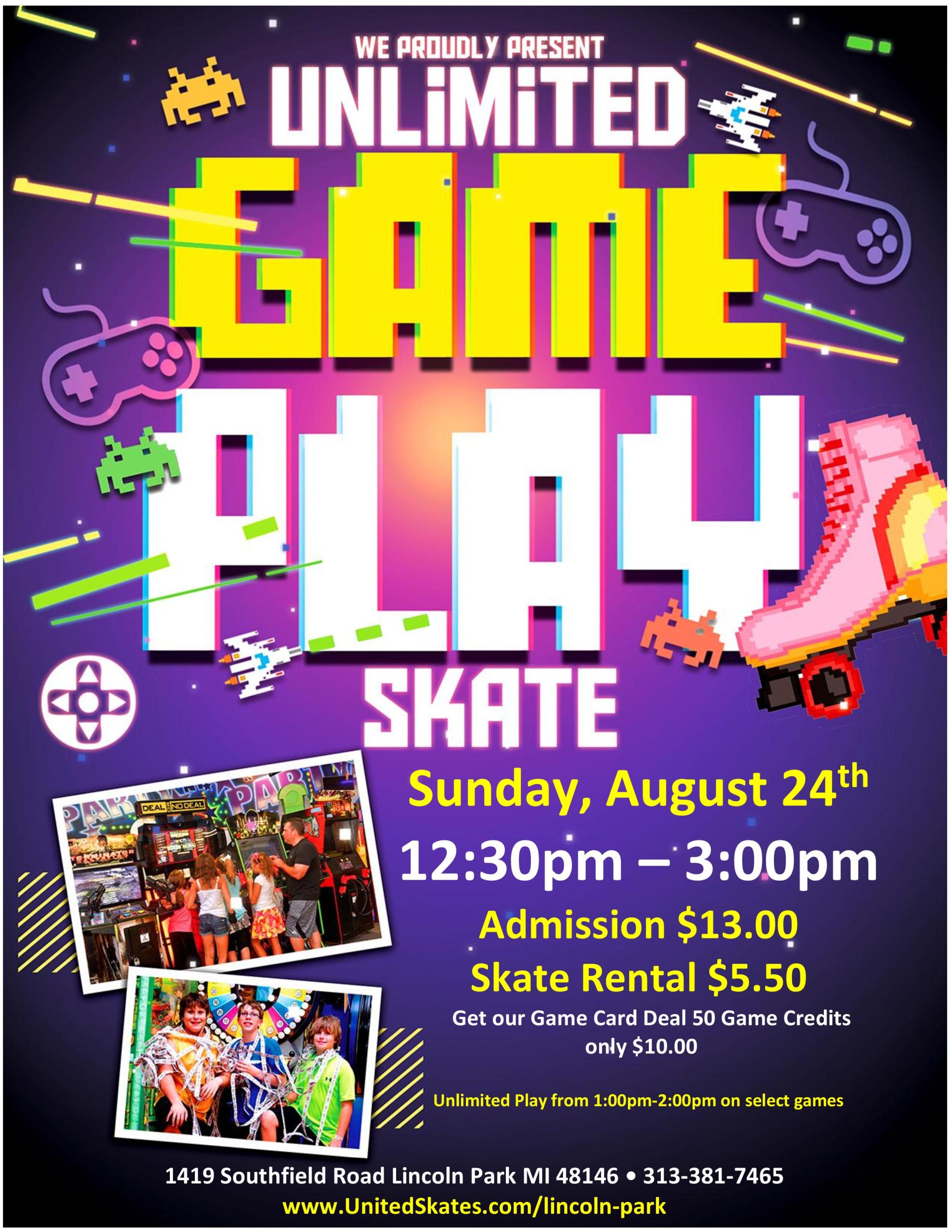 Join us for an exciting day filled with fun and games! Tuesday, August 19th 12:30pm-3:00pm Admission $10.00 Skate Rental $5.50 Every paid admission will receive a 10-credit game card Bring your friends and compete for high scores while making awesome memories. Book your daycare, YMCA, Summer Camp etc. Call our Sales Team 313-381-7465