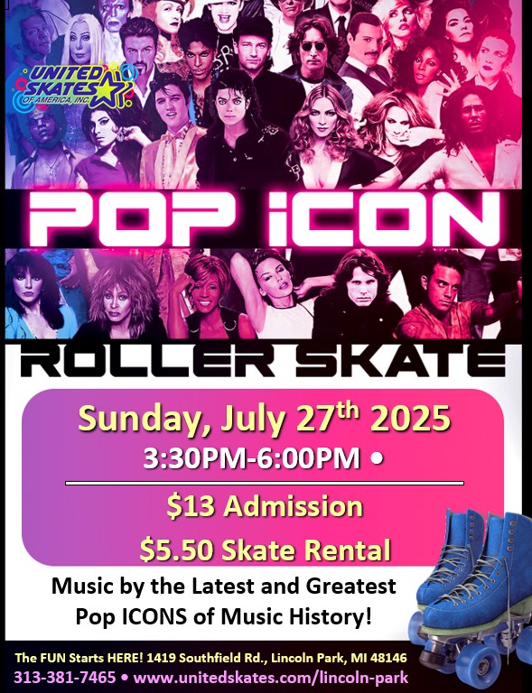 Music from all the best icons throughout history! Everyone from Madonna to Lady Gaga and more! July 27th 2025, 3:30PM-6:00PM Special Summer Deal $5 Admission (reg $13 Admission) $5.50 Skate Rental