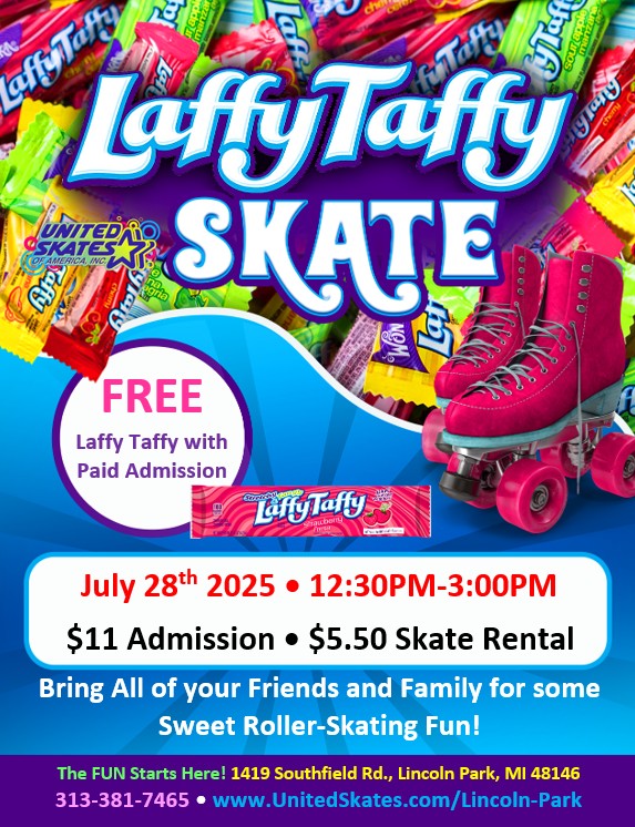 July 28th 2025 It's a LAFF! With Laffy Taffy! $11 Admission $5.50 Skate rental pop top 40 Free laffy taffy with paid admission Nothing is as sweet as this deal!