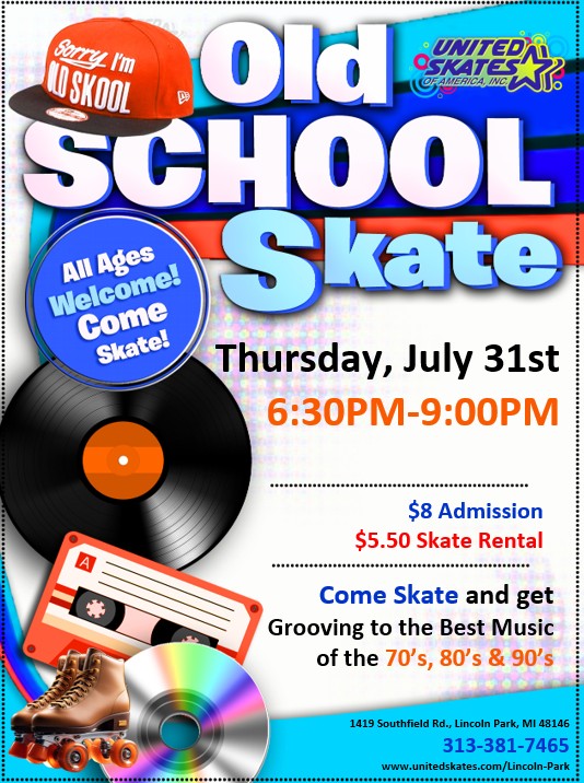 July 31st 2025 6:30PM-9:00PM $8 Admission $5.50 Skate Rental We will be playing all the best old school music- 70's, 80's and 90's! |