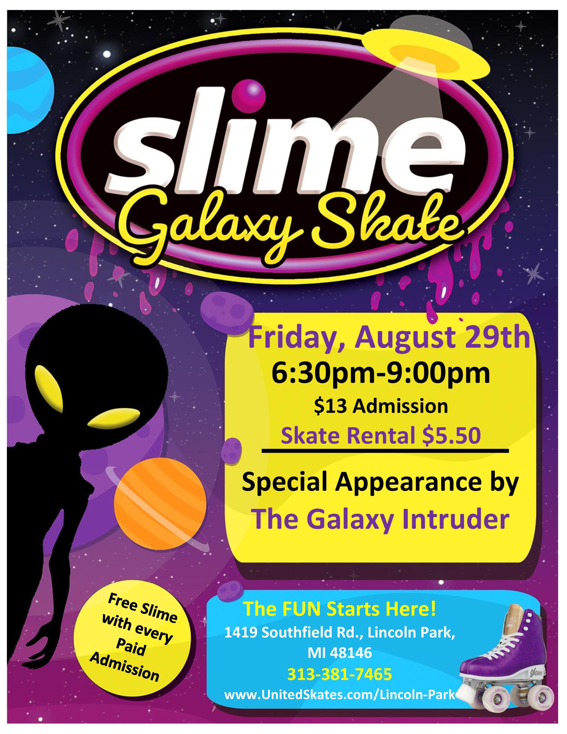 🛸👽 READY TO KICK OFF LABOR DAY WEEKEND?! 👽🛸Word’s gotten out... and some of our friends from outer space are landing at the rink! 🌌✨ 🗓️ Friday, August 29th🕕 6:30PM – 9:00PM Admission $13.00 Skate Rental $5.50 They heard we’re throwing a party—and guess what?💚 Their favorite thing in the universe is… SLIME! 🎉 Get […] |