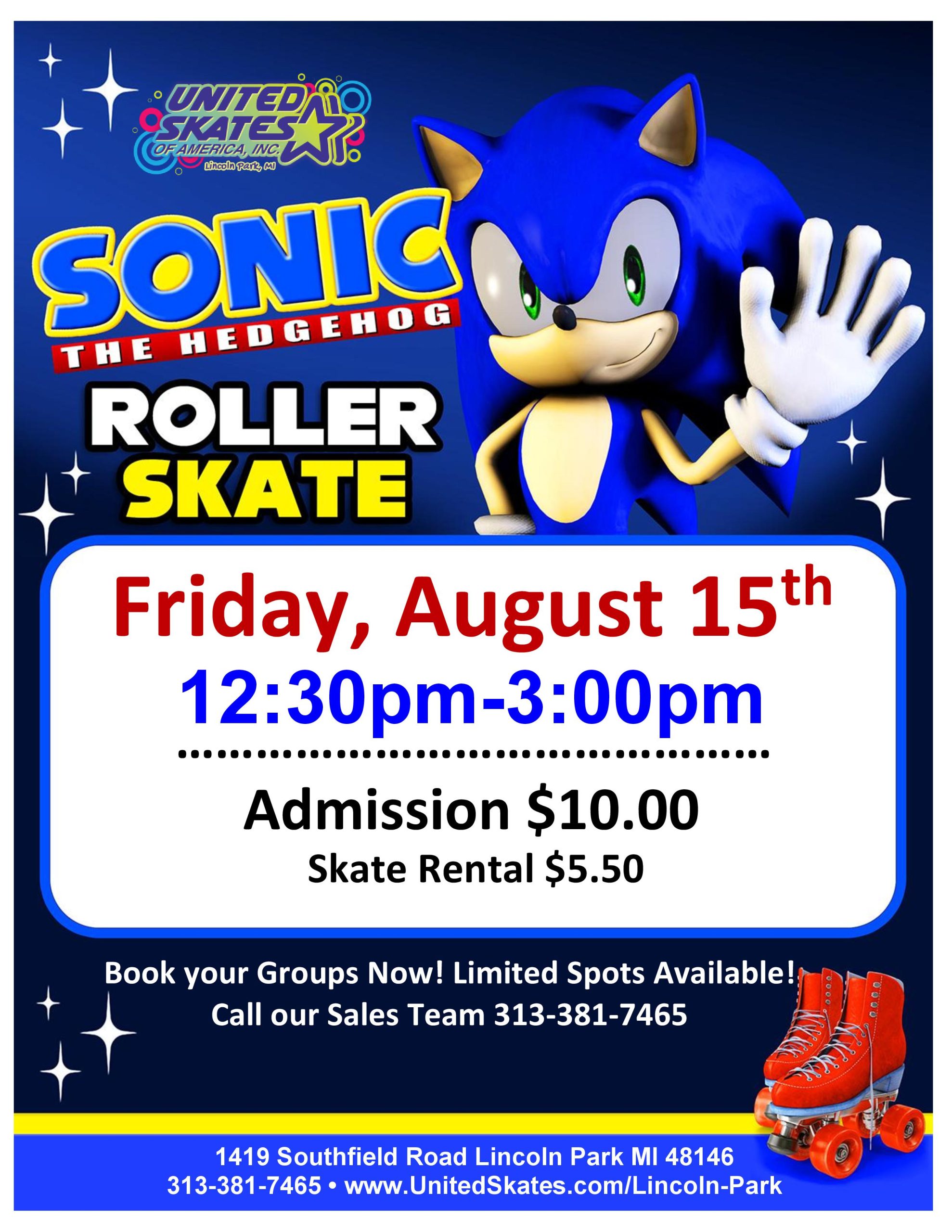 💙🦔 CALLING ALL SONIC FANS! 🦔💙Get ready to kick off your weekend at supersonic speed! ⚡ 🎉 Join us Friday, August 15th🕐 12:30PM – 3:00PMAnd hang out with the one and only SONIC himself! 🌀 Admission $10.00 Skate Rental $5.50 Skate, snap pics, and race your way into an unforgettable afternoon of fast-paced fun! Perfect […]