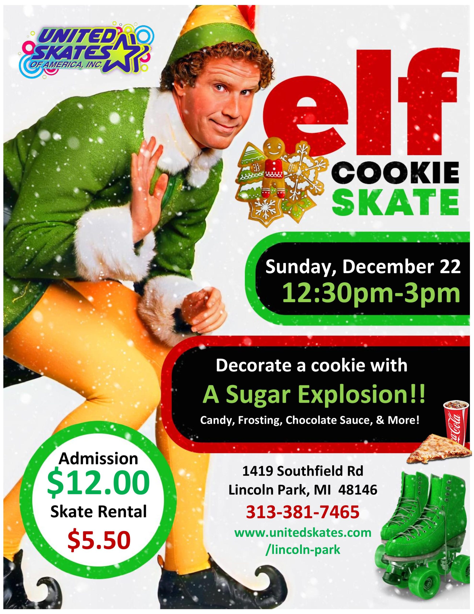 Feeling that holiday spirit? Come decorate a cookie at United Skates! Choose your toppings at our cookie bar and create your own unique cookie! Monday, December 16th 6pm-8pm Admission $10.00 Skate Rental $5.50 Free cookie decorating with every paid admission Special Appearance by our Special Elf!
