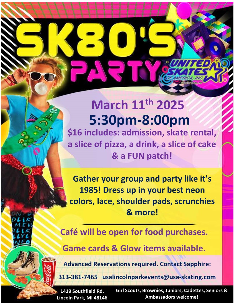 If you are a Girl Scout or Girl Scout leader, you are not going to want to miss this awesome event! Pre-Registration is required ask for Sapphire @ 313-381-7465 or email us at usalincolnparkevents@usa-skating.com. $16.00 includes admission, skate rental, slice pizza,drink,slice of birthday cake and a Fun patch. Make sure to dress in Neon or […] |