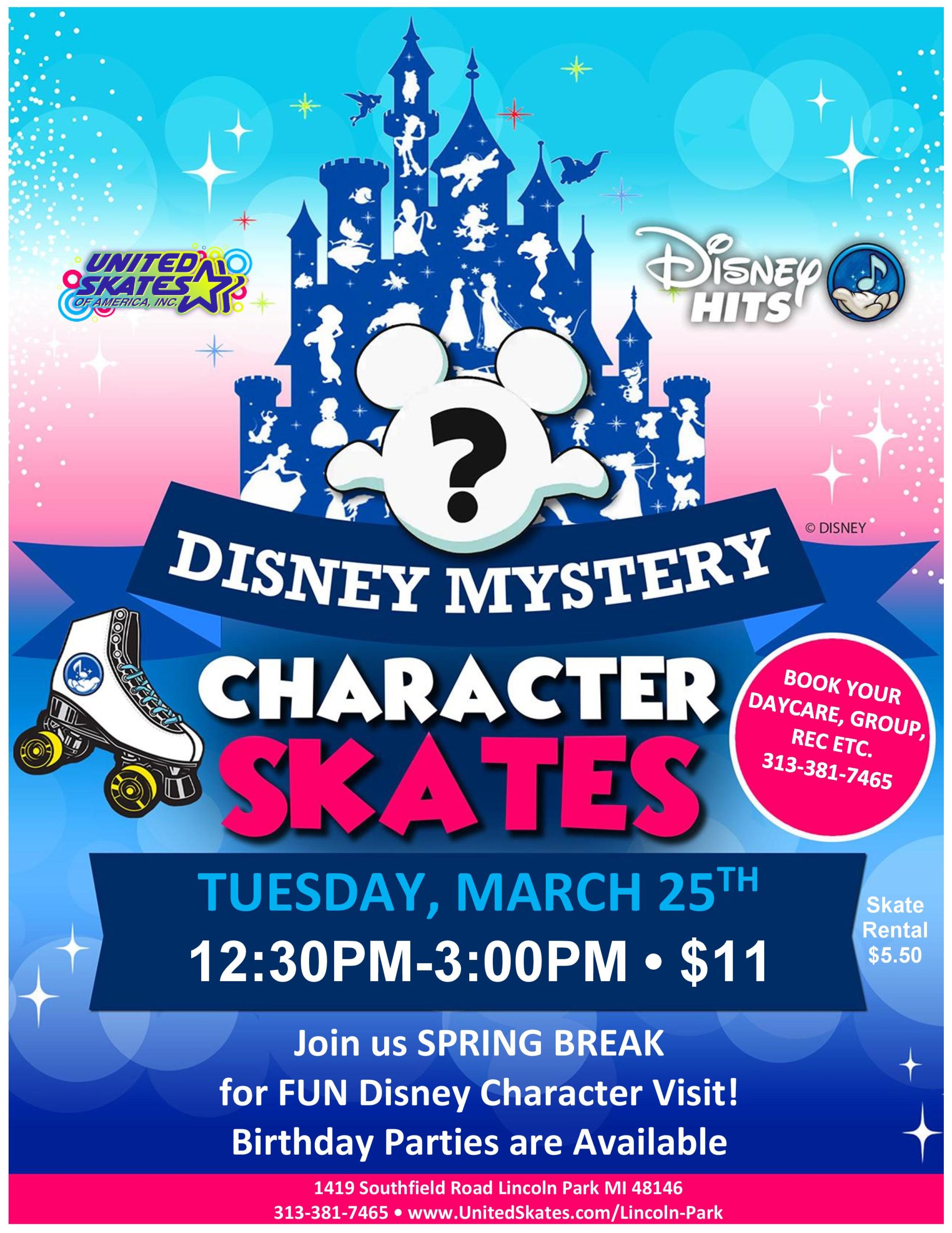 Get ready for a magical Disney Day! We’re mixing classic Disney tunes with today’s pop music! Tuesday, March 25th 12:30pm-3:00pm Admission $11.00 Skate Rental $5.50 Join us for fun Disney giveaways and a day full of enchantment. Bonus: There might be some special appearances from some of your Disney Favorites…. We are taking bookings for […]