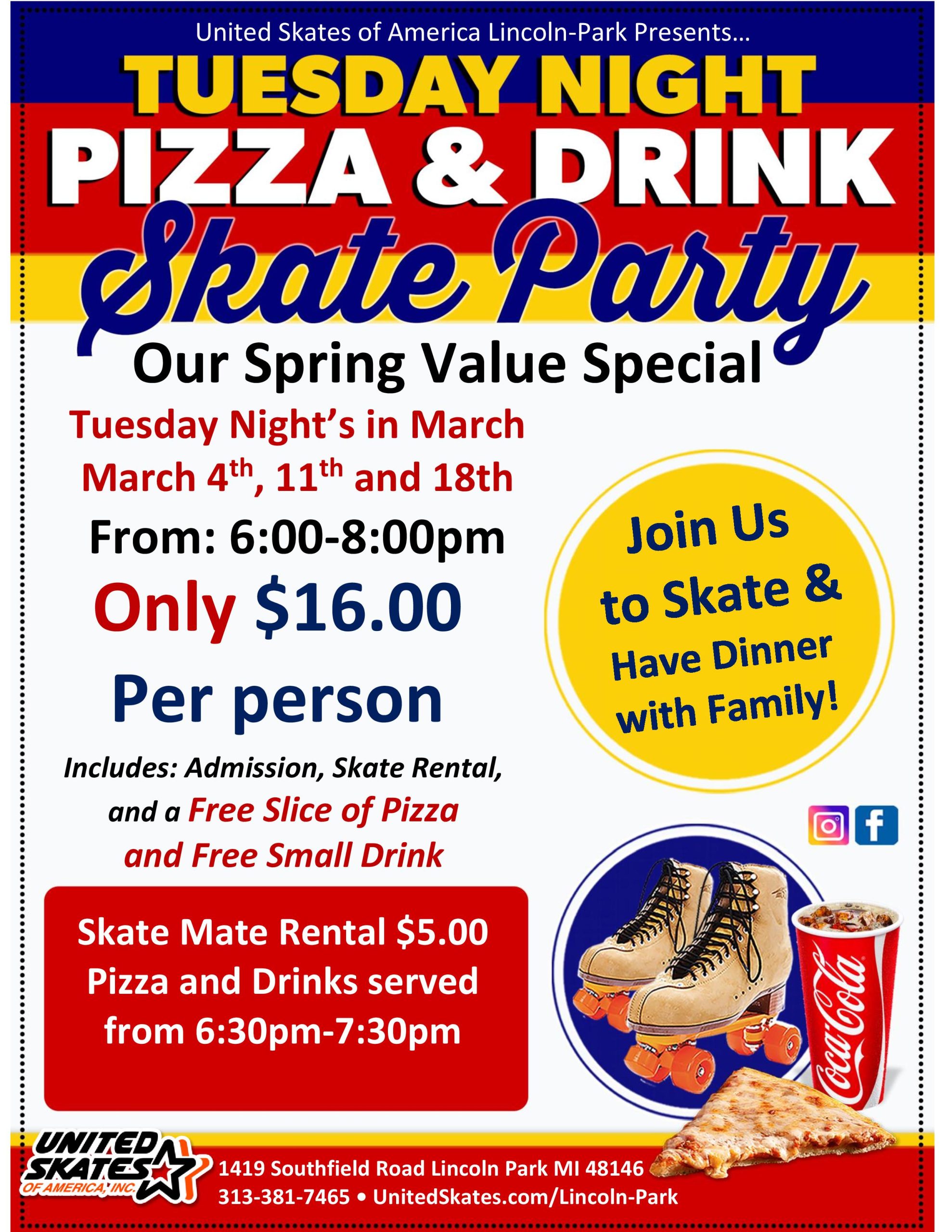 April 3rd from 6:30pm-8:30pm $12.00 admission, skates, slice of pizza and drink |