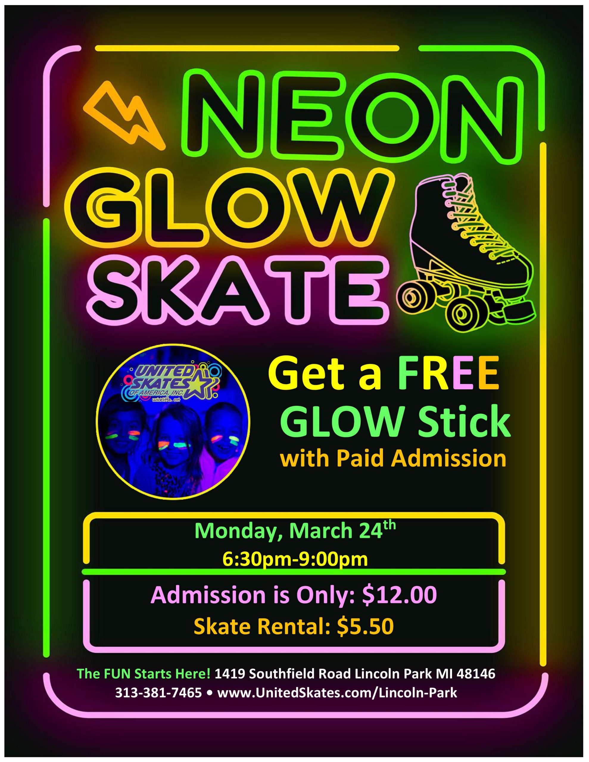 Are you prepared for an electrifying Monday Funday? Join us for a Neon Glow Skate that promises to light up your day! We’re super excited, and we want to see you shine! Monday, March 24th 6:30pm-9:00pm Admission $12.00 Skate Rental $5.50 Free glowstick with paid admission Come dressed in your best all-white attire or your […] |