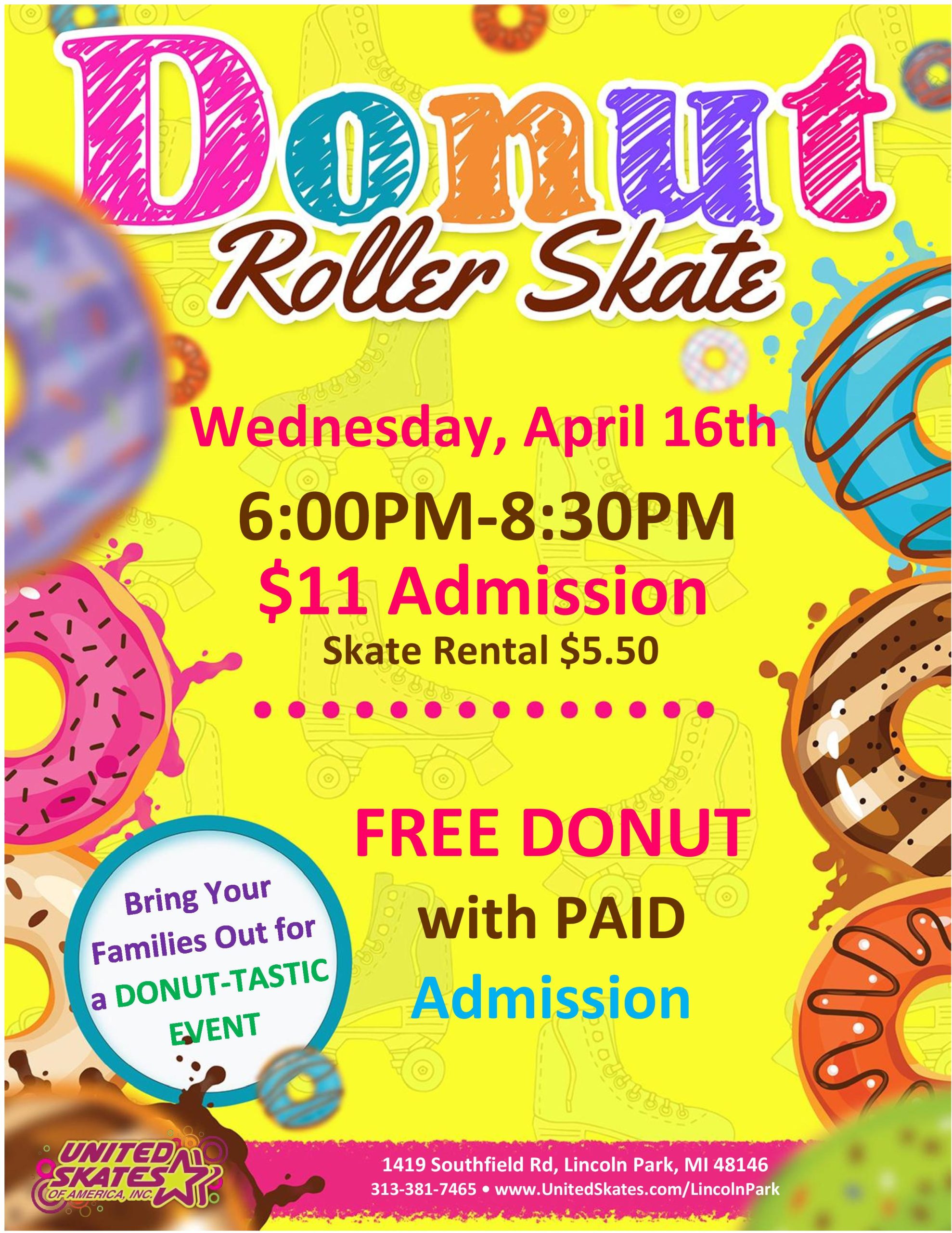 Join us for a delightful Free Donut Skate! Enjoy a sweet treat with your paid admission and indulge in a delicious donut! Wednesday, April 16th 6:00pm-8:30pm Admission $11.00 Skate Rental $5.50 It's the perfect way to satisfy your cravings and have a blast on the rink!