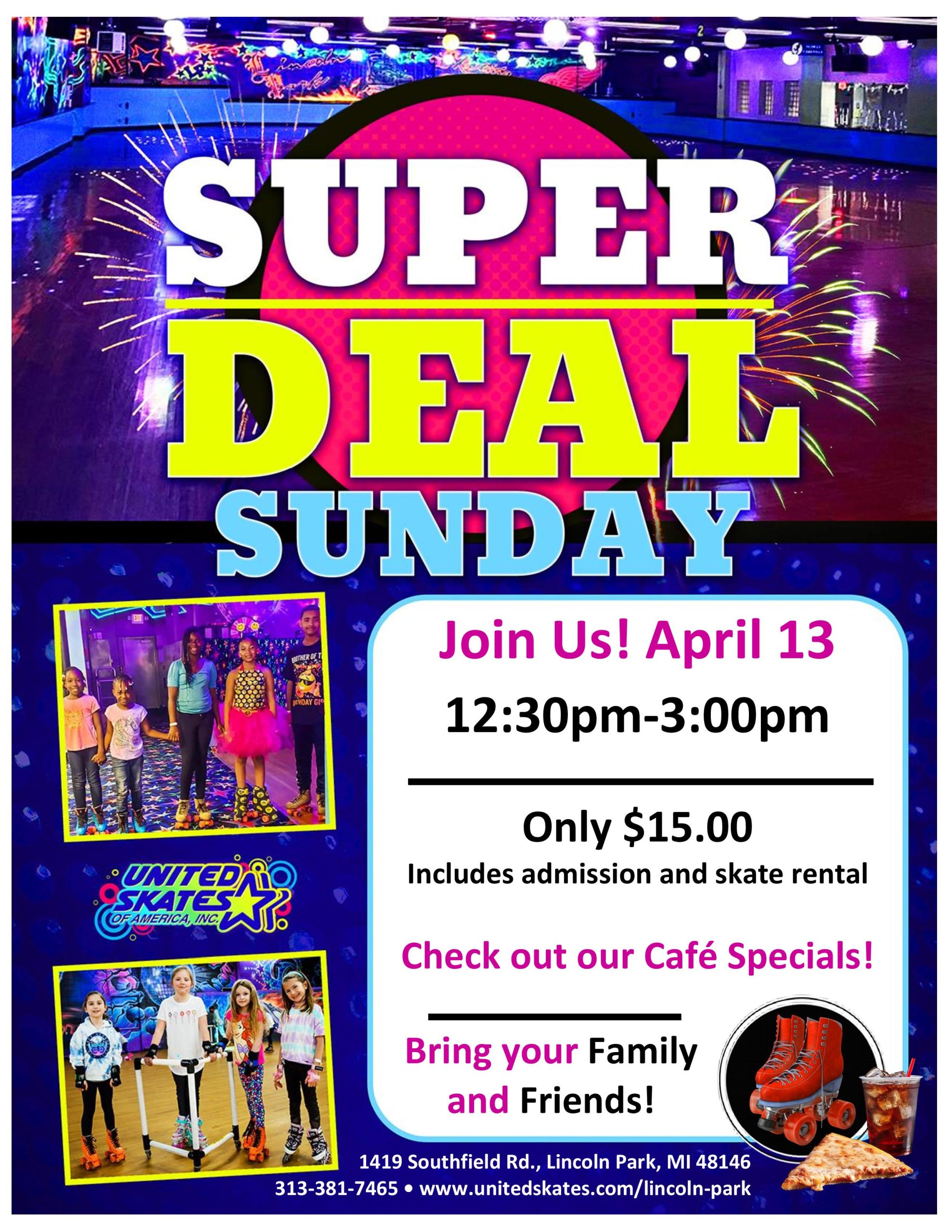 Get ready for an incredible opportunity! Mark your calendars for Super Deal Sunday on April 13th 12:30pm-3:00pm You can enjoy both admission and skate rental for an unbeatable price. Only $15.00!!! This is a fantastic chance to have a blast, so don’t let it slip away!
