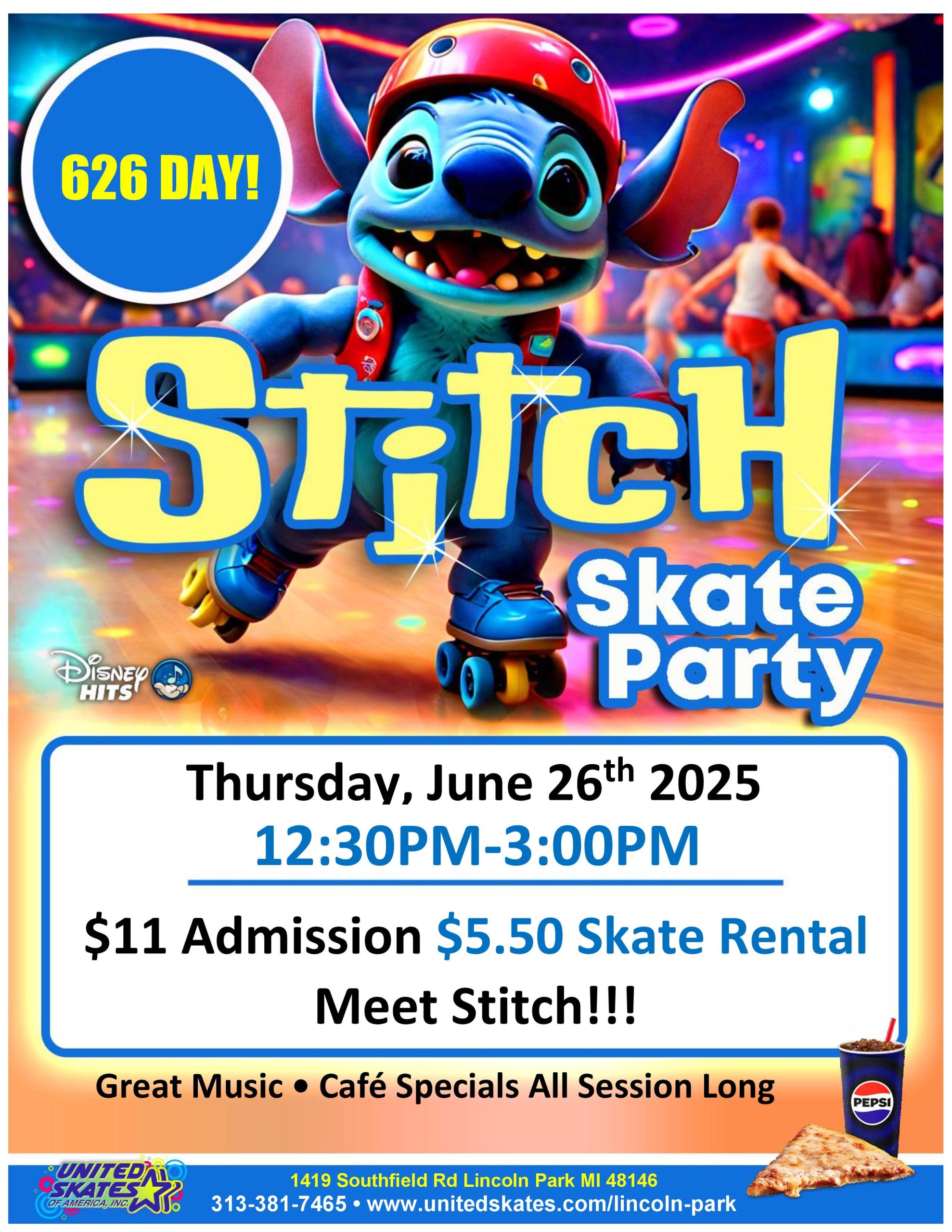 Attention all Stitch enthusiasts. It's time to celebrate 626 Day with our favorite little blue alien. Join us for a day full of fun, festivities, and all things Stitch. Come together with fellow fans to honor this beloved character! Thursday, June 26th 12:30pm-3:00pm Admission $11.00 Skate Rental $5.50