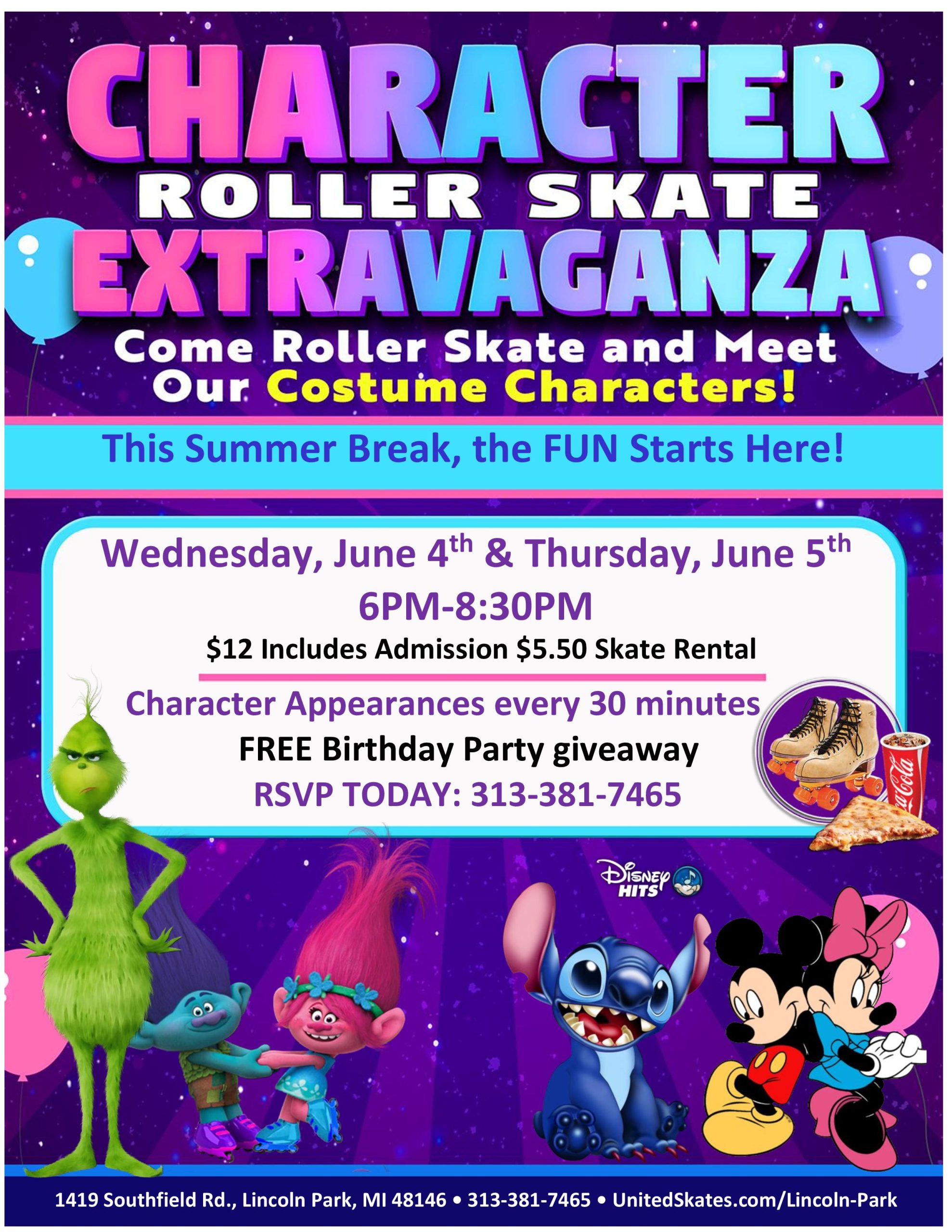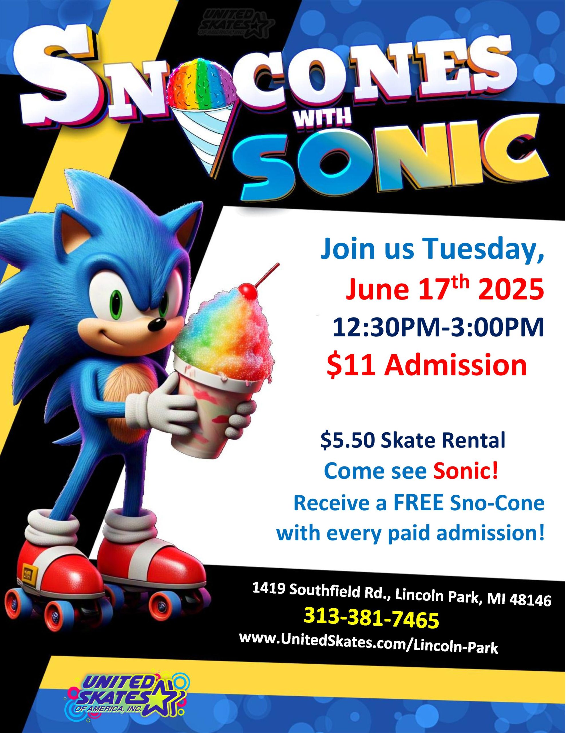 Saturday, July 5th 2025 12:30PM-3:00PM Meet Sonic and skate to the best hits! FREE Popsicle with Paid Admission! $13 Admission & $5.50 Skate Rental