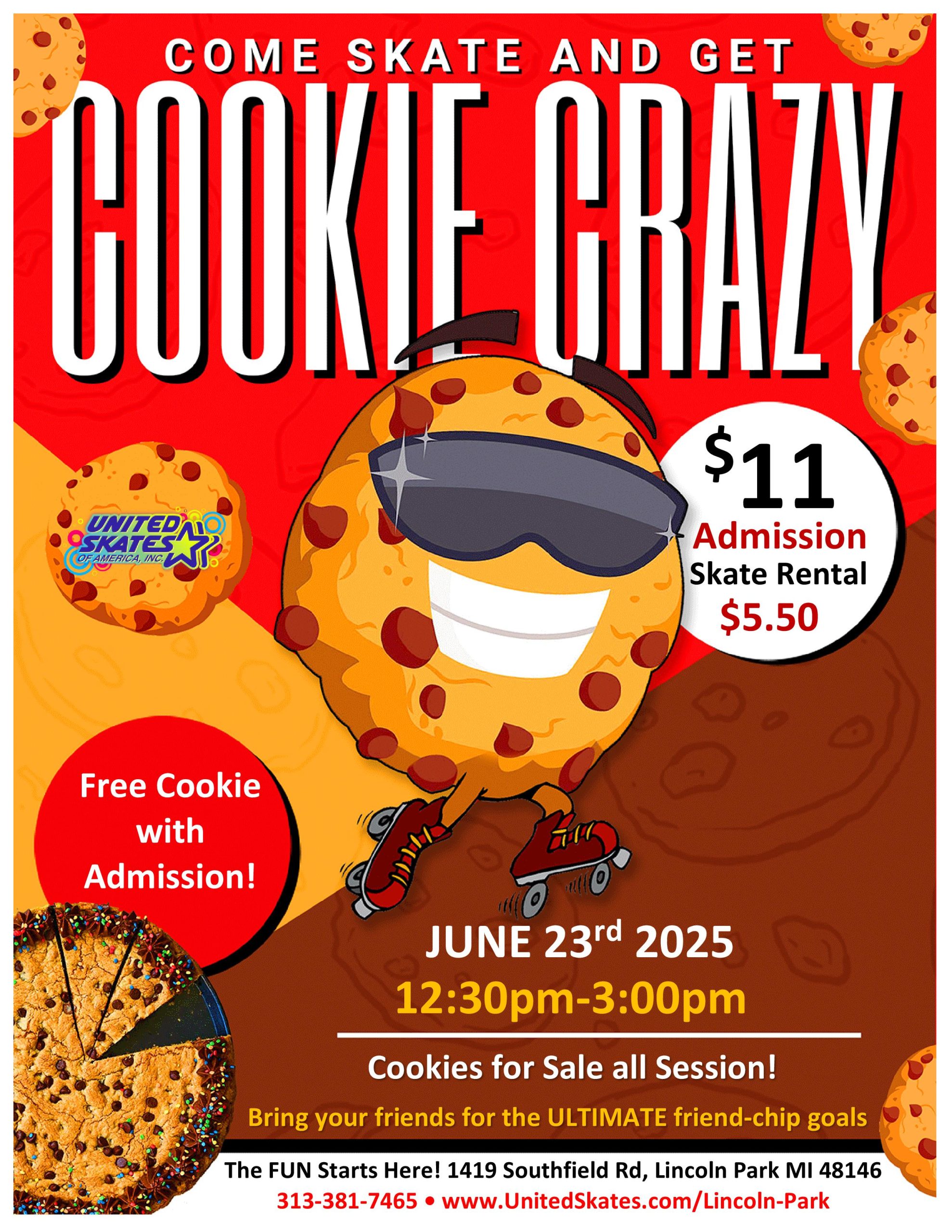 Are you ready for our cookie craze skate?! Nothing as tasty as a cookie! $13 admission $5.50 Skate rental Free cookie with paid admission July 5th 2025 3:30PM-6:00PM |