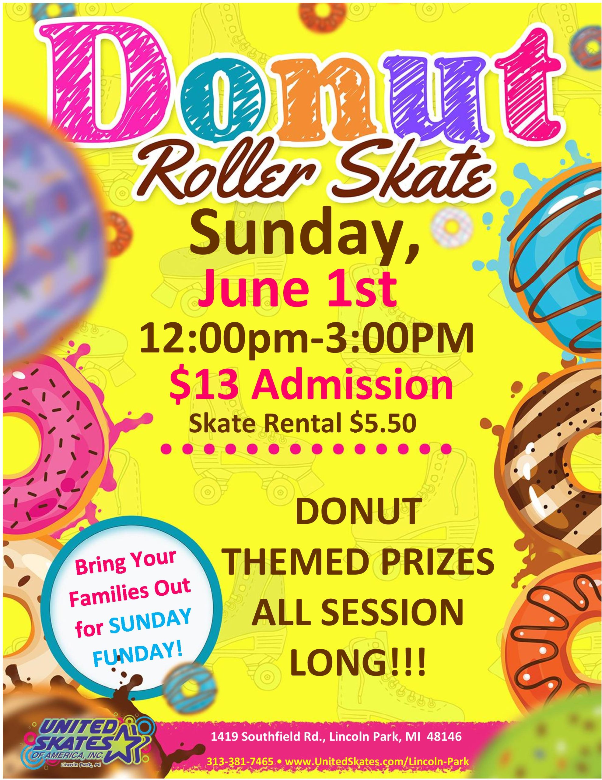 Are you a donut lover? If so, this is the event for you! Join us for a delightful Sunday Funday where you can come out and win some exciting donut-themed prizes. Sunday, June 1st 12:30pm-3:00pm Admission $13.00 Skate Rental $5.50