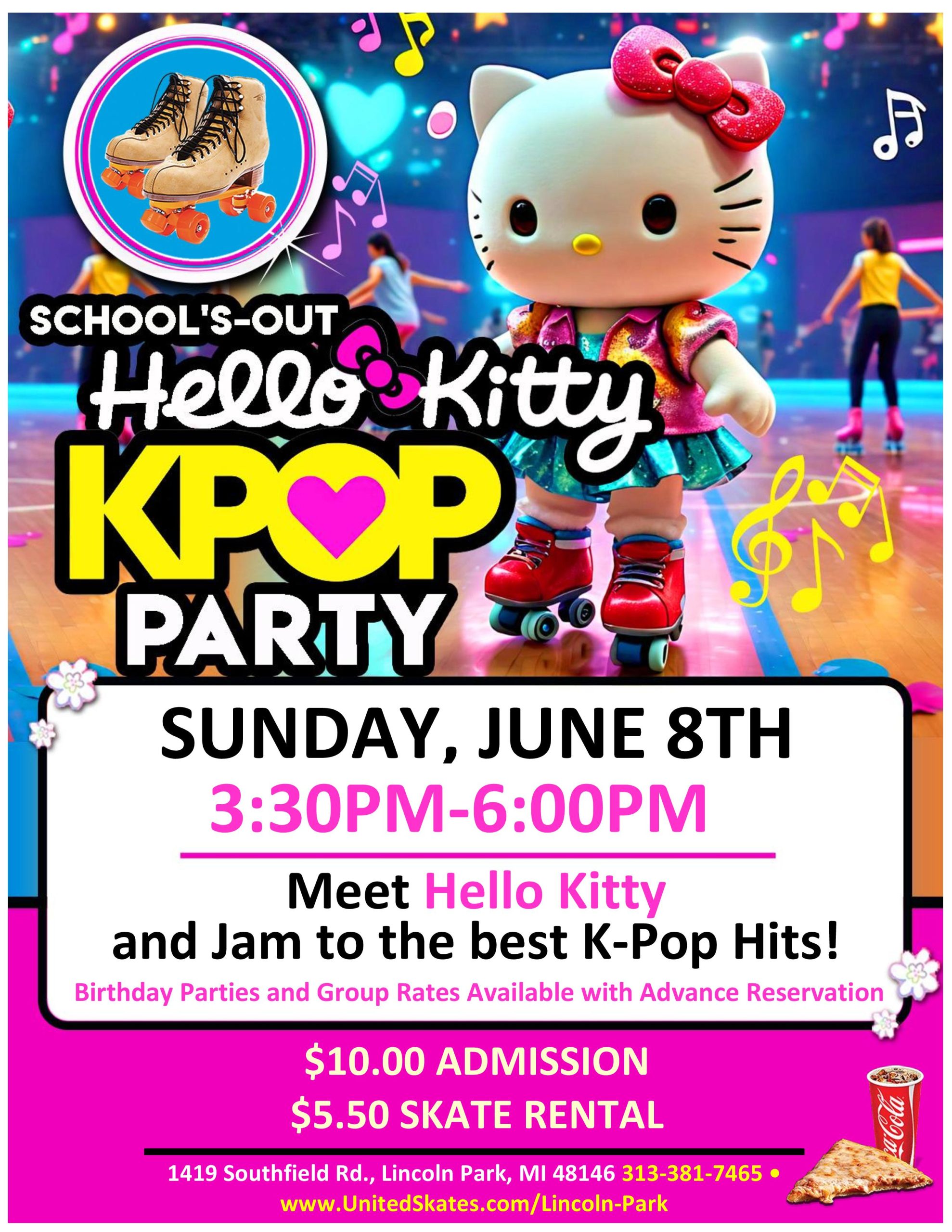 Attention Hello Kitty fans! This Sunday funday is specially designed for you! Join us for an exciting opportunity to meet Hello Kitty live and in person. Enjoy the vibrant atmosphere filled with K-Pop music that will keep the energy high and smiles bright. Sunday, June 8th 3:30pm-6:00pm Admission $10.00 Skate Rental $5.50 |