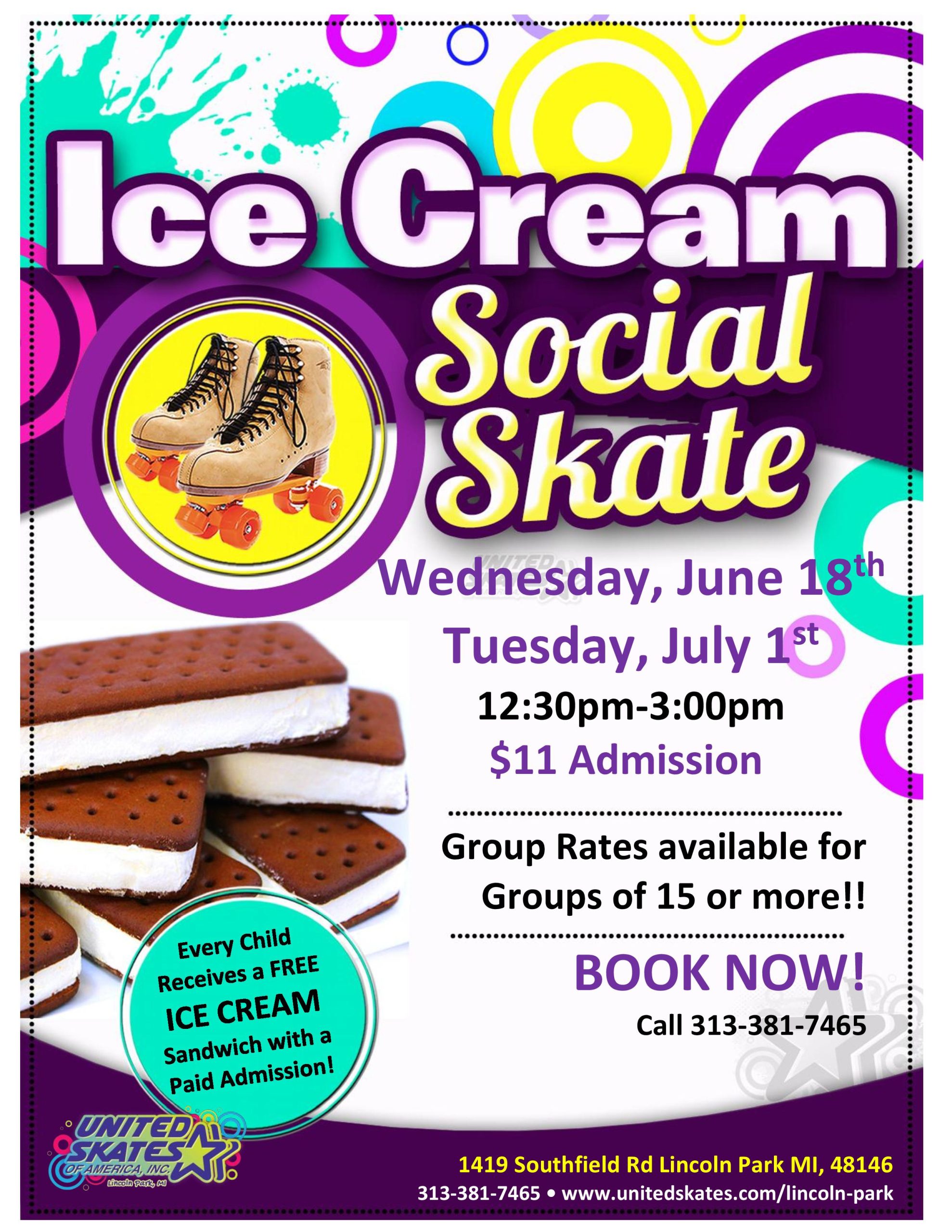 Get ready for an Ice Cream Sandwich Skate event! Calling all ice cream lovers-come cool down and enjoy a delicious treat. You'll receive a free ice cream sandwich with your paid admission Wednesday, June 18th and Tuesday, July 1st 12:30pm-3:00pm Admission $11.00 Skate Rental $5.50 |