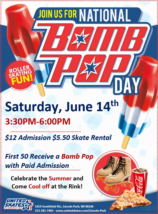Do you love popsicles? The FIRST 50 receive a FREE popsicle with paid admission. Make sure to come dressed in your red, white, and blue attire to join in on the fun and celebrate in style. Saturday, June 14th 3:30pm-6:00pm Admission $12.00 Skate rental $5.50