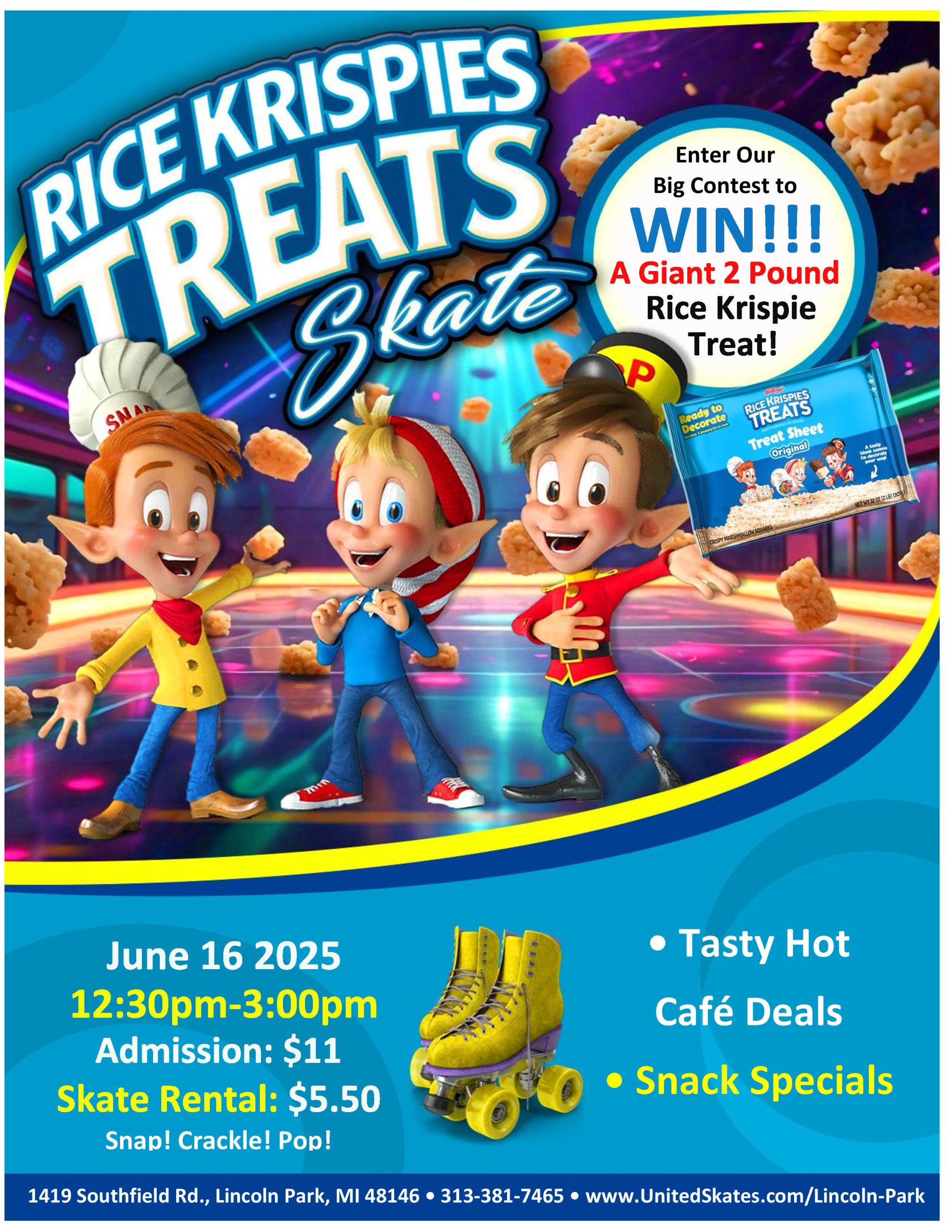 Who’s ready to celebrate with a chance to win a massive Giant Rice Krispie treat? This is your golden opportunity to indulge in a scrumptious, crispy delight that’s sure to satisfy any sweet tooth. Monday, June 16th 12:30pm-3:00pm Admission $11.00 Skate Rental $5.50 Book your Group Today! Call our Sales Team 313-381-7465 |