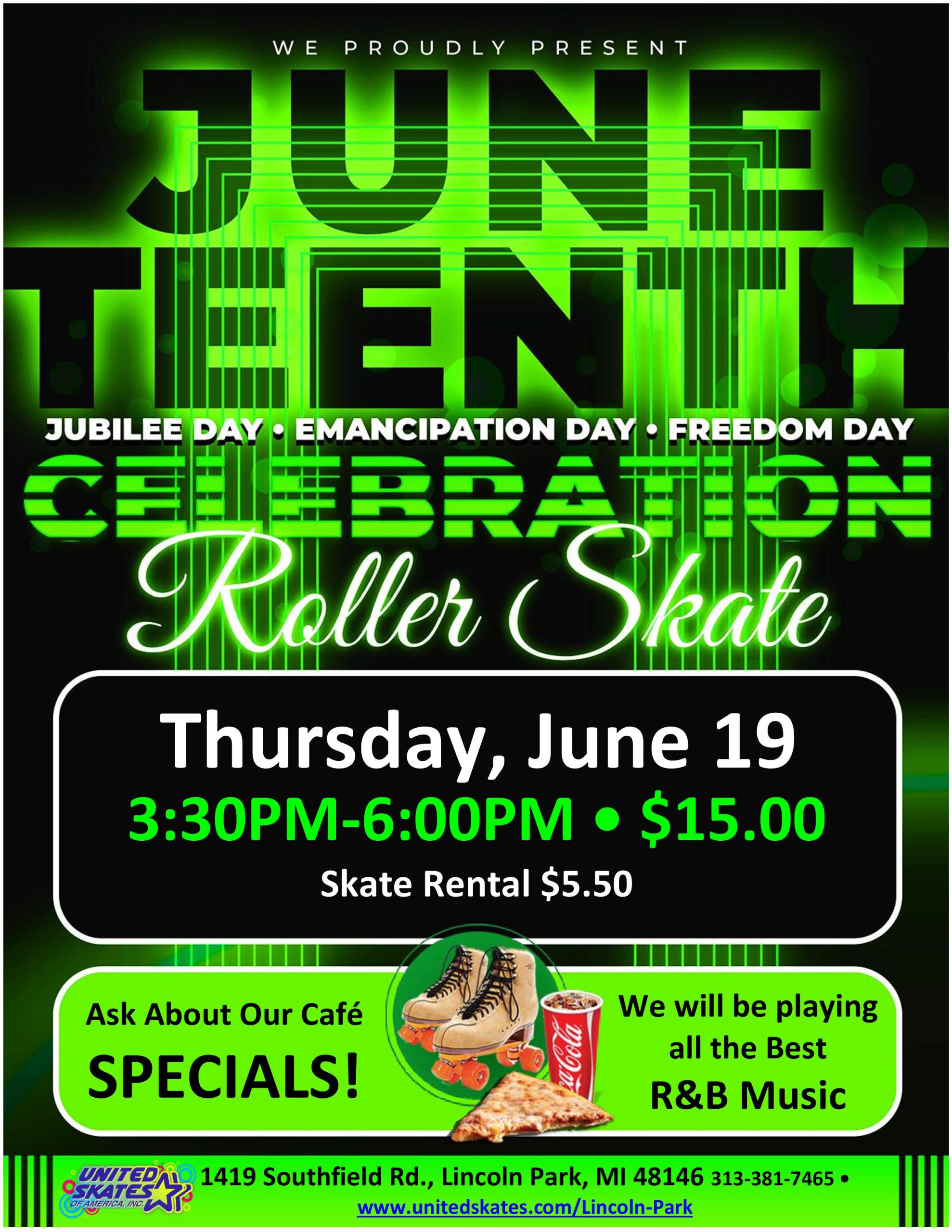 Join us in celebrating Juneteenth on the rink! Bring your family and friends for an afternoon of joy, unity and community spirit. Let's come together to honor this significant occasion while enjoying a fun-filled time on the rink. Thursday, June 19th 3:30pm-6:00pm Admission $15.00 Skate Rental $5.50