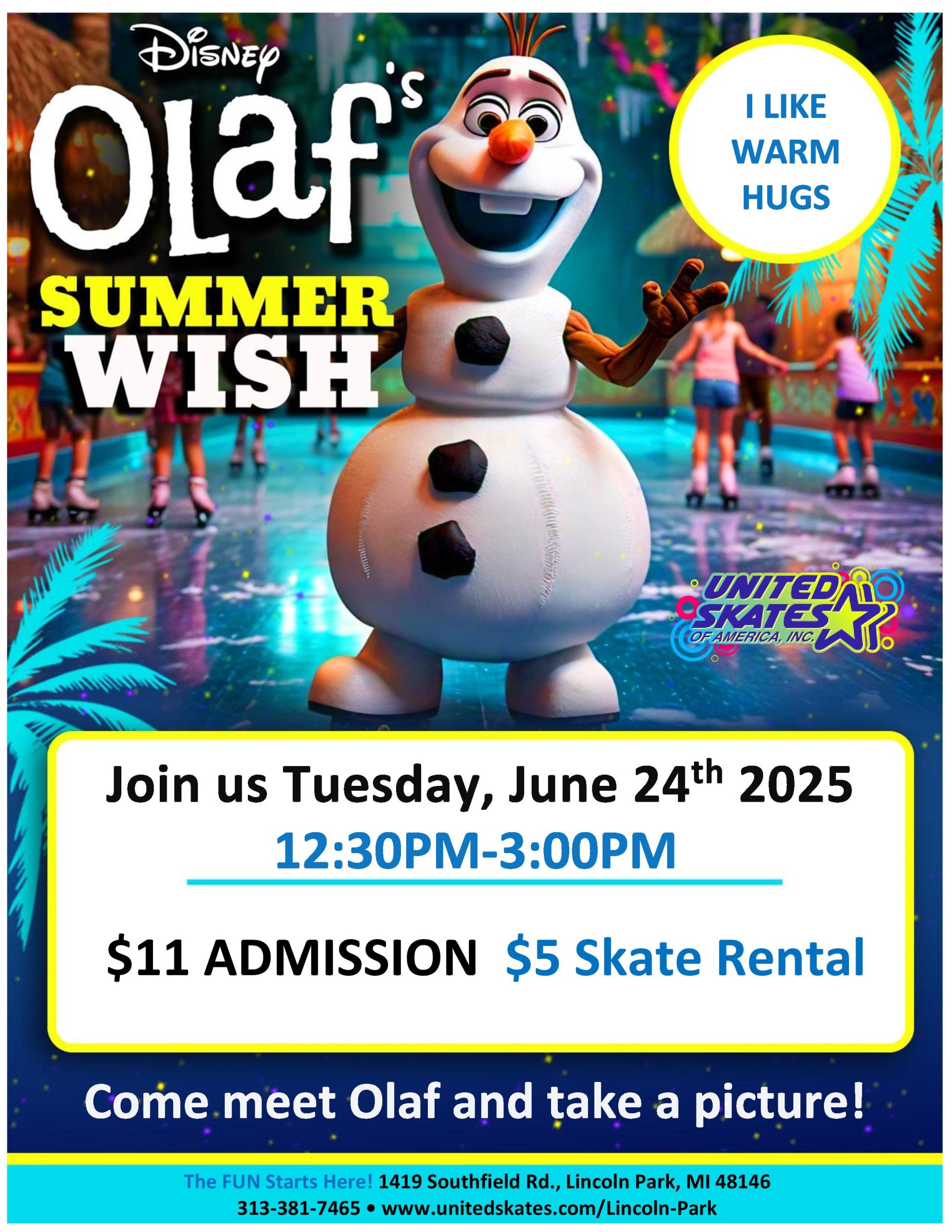 It's all about Olaf! Come and experience the joy as this lovable snowman celebrates the warmth of summertime! Join us for a delightful time meeting Olaf, who can't help but spread happiness wherever he goes Tuesday, June 24th 12:30pm-3:00pm Admission $11.00 Skate Rental $5.50 |