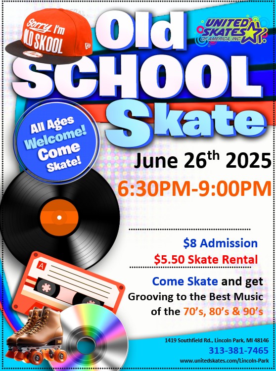 From 6:30PM-9:00PM, we will be rocking the very best old school music from the 70'a, 80's and 90's. Join us for a lot of fun, the best music and the best deals! June 26th 2025 $8 Admission $5.50 Skate Rental |
