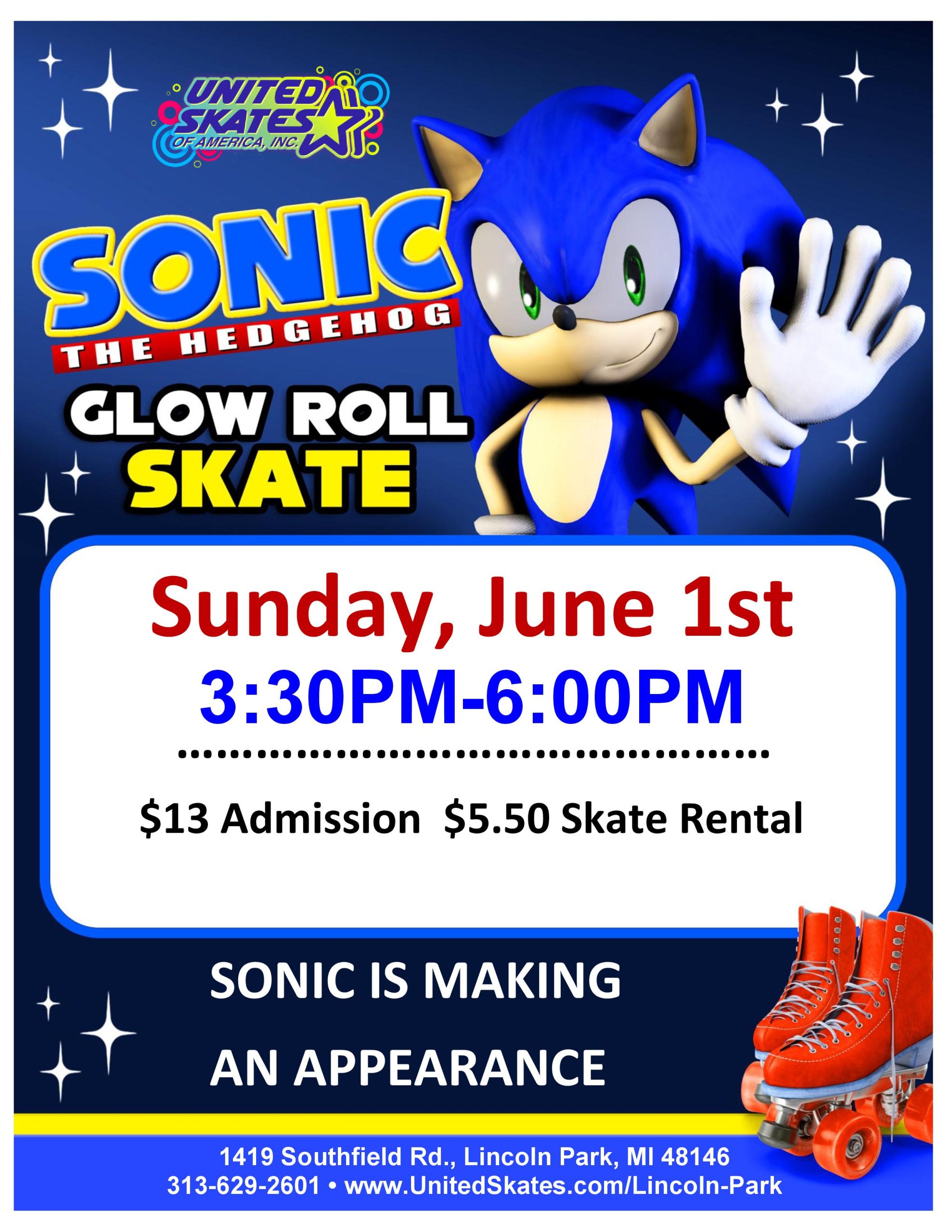 Attention Sonic Fans! Are you ready for an incredible experience? Come get your glow on and meet Sonic in person! This is your chance to connect with your favorite character, enjoy some fun activities, and create unforgettable memories. Sunday, June 1st 3:30pm-6:00pm Admission $13.00 Skate Rental $5.50 |