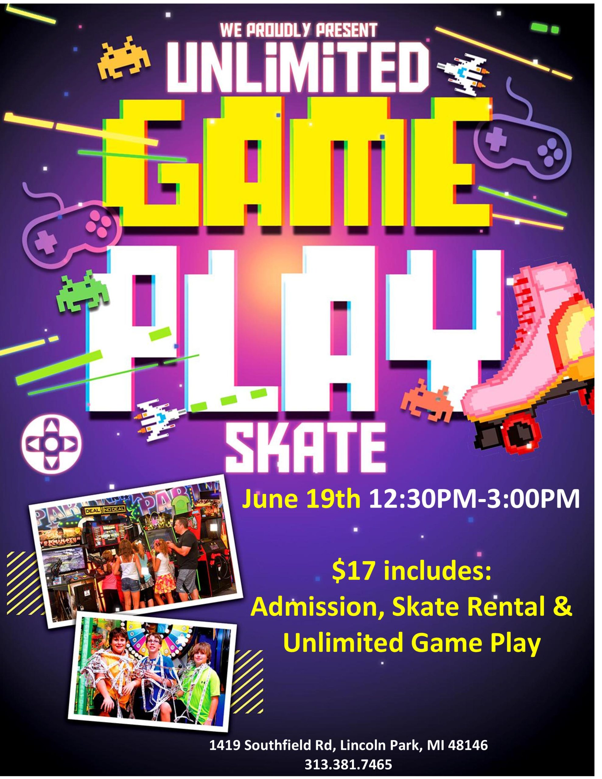 It's time for our Unlimited Game Play Skate event. Enjoy unlimited play with your admission and dive into a world of fun arcade games. Bring your friends and family for an unforgettable day filled with laughter, excitement, and memorable moments. Thursday, June 19th 12:30pm-3:00pm Admission $17.00 includes skate rental and unlimited game play