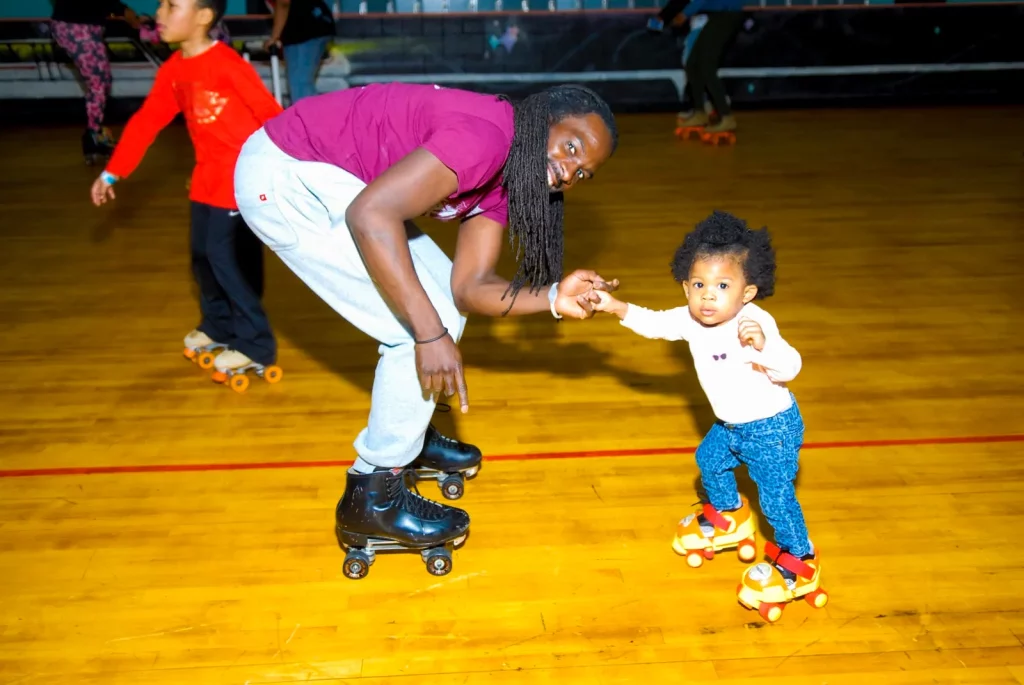 Our littlest skaters will benefit from learning on adjustable skates so make sure to wear your favorite gym shoes. These skates allow children to move through three stages: Stage 1, allows children to walk in the skates to get a feel for them. For Stage 2, the wheels only move forward. And finally Stage 3 is freewheeling fun! Adults are welcome to walk with their children on the skate floor. We just please ask that you wear tennis shoes on our wood floor.