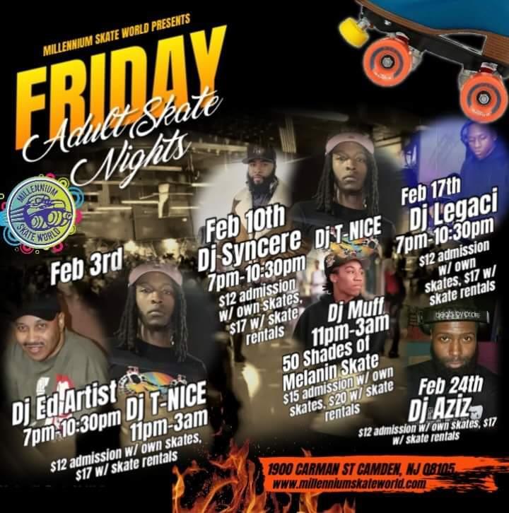 Every Friday Night Adult Skate 7pm-10:30pm $12.00 Admission with Own Skates $17.00 Admission with Rental skates/ Spectators DJ's on rotation, varies each week Perfect night for an Adult Birthday party, Meetup, Get Together Adults age 18 and over, Security may ask for ID Complete the Waiver: MILLENNIUM SKATE WORLD (bookingzone.com)