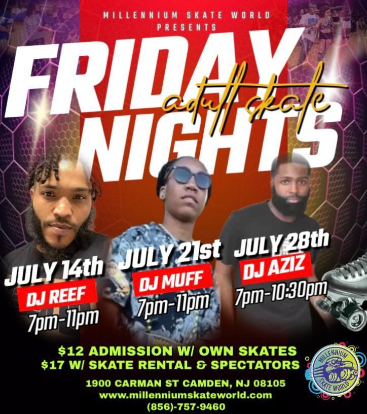 Friday Night Adult Skate 7pm-10:30pm Book a Birthday party Perfect Night for a Get Together Adults age 18 + Bring ID DJ rotation, varies each week $12 Admission with own skates $17 admission with rental skates/Spectators