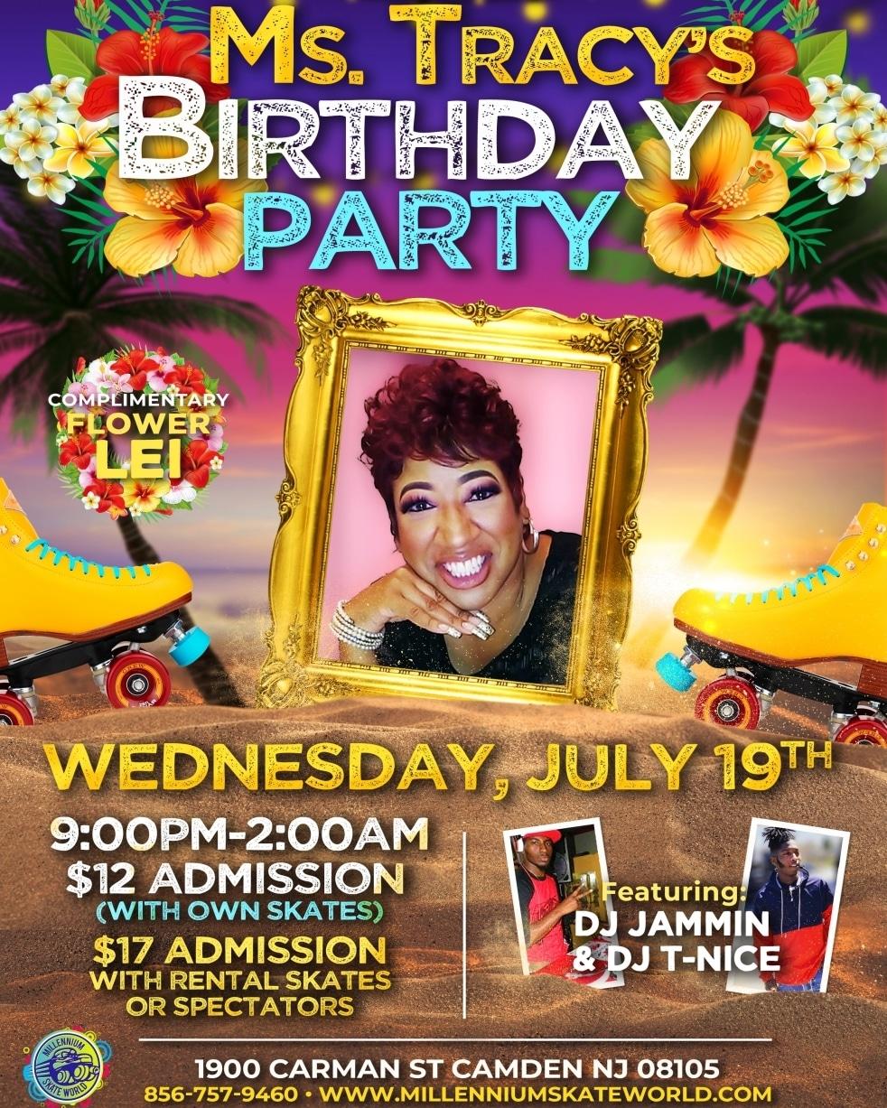 Wednesday Adult Night Skate Celebrating Ms Tracy Birthday "Hawaiian Luau Theme" Complimentary Lei Delicious Food 9pm-2:00am Featuring DJ T-Nice and Jammin $12.00 Admission with own personal Skates $17.00 Admission with Rental skates/Spectators |