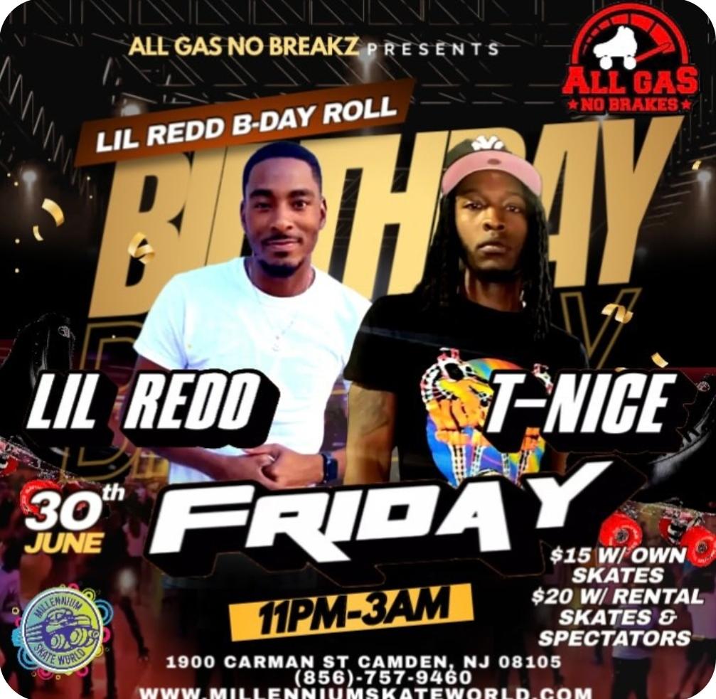 All Gas No Breaks presents Adult Night Late Skate Birthday Celebration for DJ Lil Redd featuring DJ T-Nice Friday June 30th 11pm-3am $15 with own skates $20 with rental skates/Spectators |