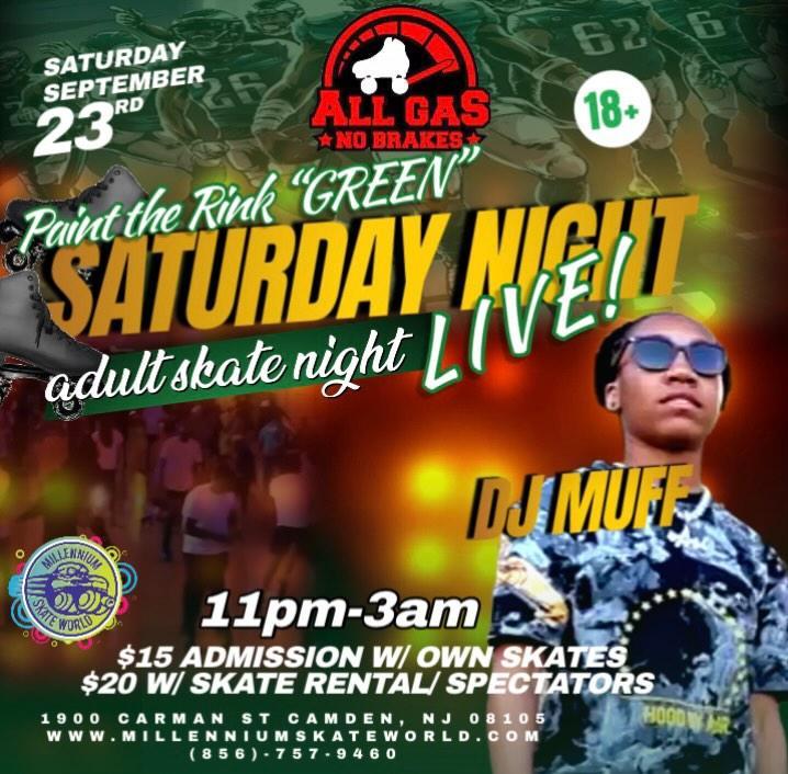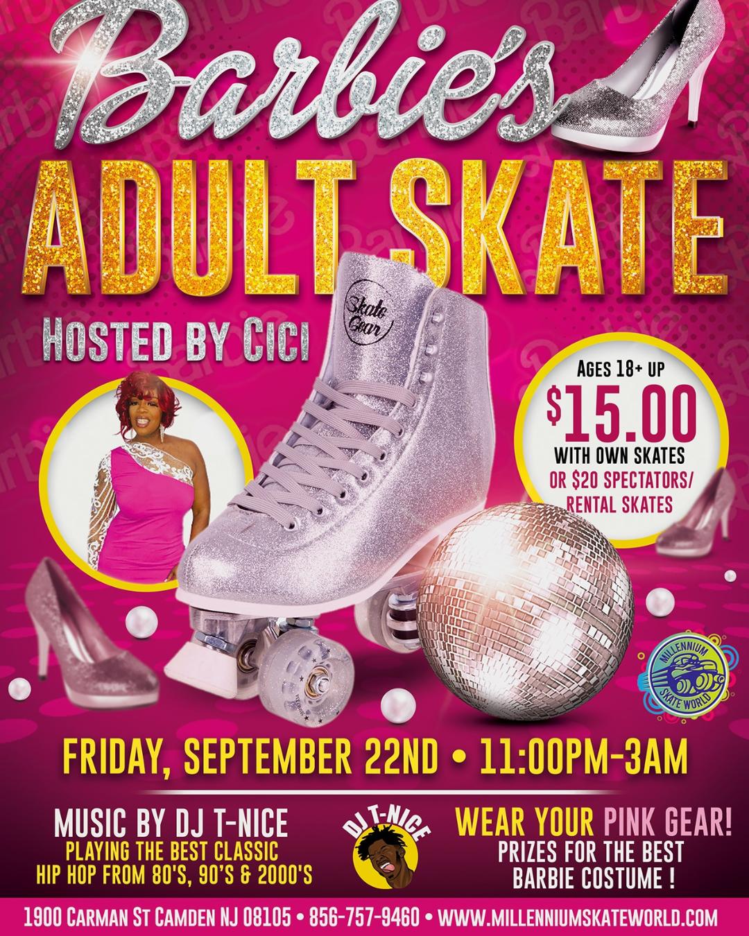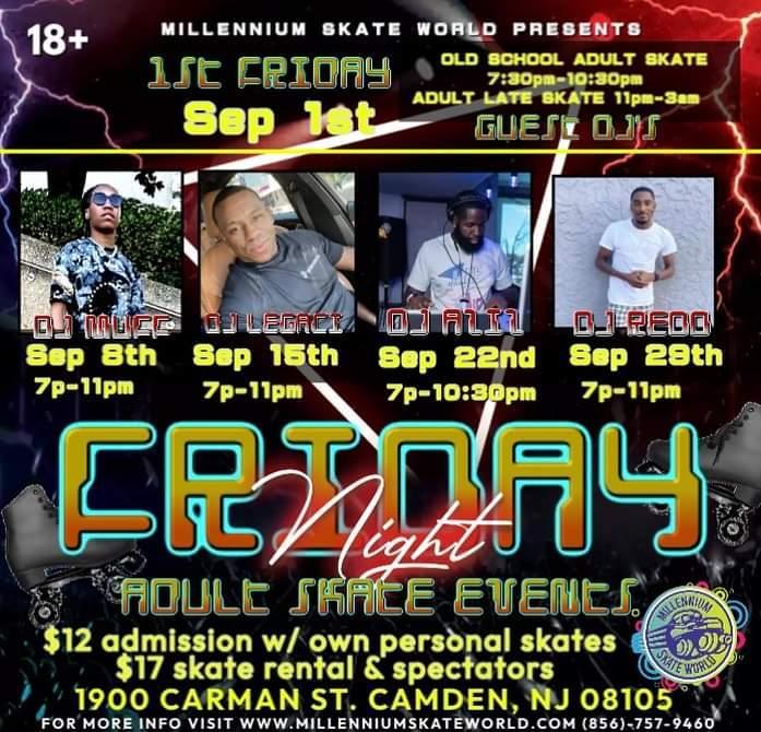 1st Friday Night Adult Skate 7pm-10:30pm Old School 11pm-3am Late Skate Book a Birthday party Perfect Night for a Get Together Adults age 18 + Bring ID DJ rotation, varies each week $12 Admission with own skates $17 admission with rental skates/Spectators