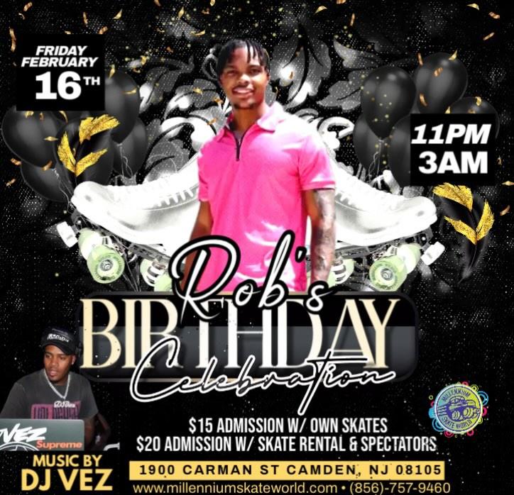 Rob's Birthday Celebration - Adult Night Skate $15 Admission with Own skates $20 Admission with Rental skates/Spectators Music by DJ Vez |