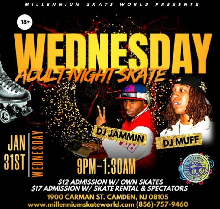 Adult Night Skate featuring DJ Jammin and DJ Muff 9pm-1:30am $12 with own skates $17 with rental skates/spectators |