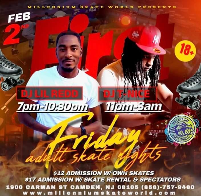 Adult Night Skate Friday Night 7pm-10:30pm DJ Lil Redd 11pm- 3am    DJ T-Nice $12 with own skates $17 with rental skates/spectators