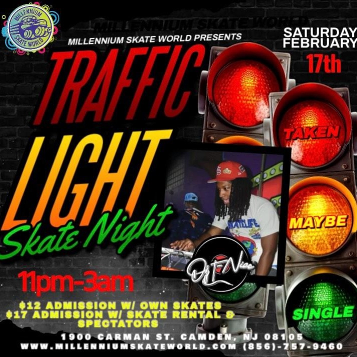 Saturday, Feb 17th 11pm-3am Traffic Light Adult Night Skate Wear RED - Taken Wear YELLOW- Maybe Wear GREEN - Single $12 with Own skates $17 with Rental skates/Spectators |