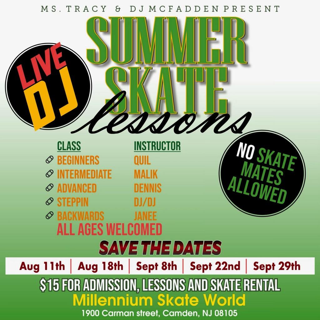 Learn Roller Skate Styles Beginners Intermediate Advanced Steppin’ Backwards Talented skating instructors: DJ, Quil, Malik, Janae, Dennis and DJ McFadden $15.00 per person includes Admission, Skate rental and Lesson ~~~~~~~~~~~ *Free Skating Lesson for the 1st (20) Camden City Residents. Must show proof of Residency.