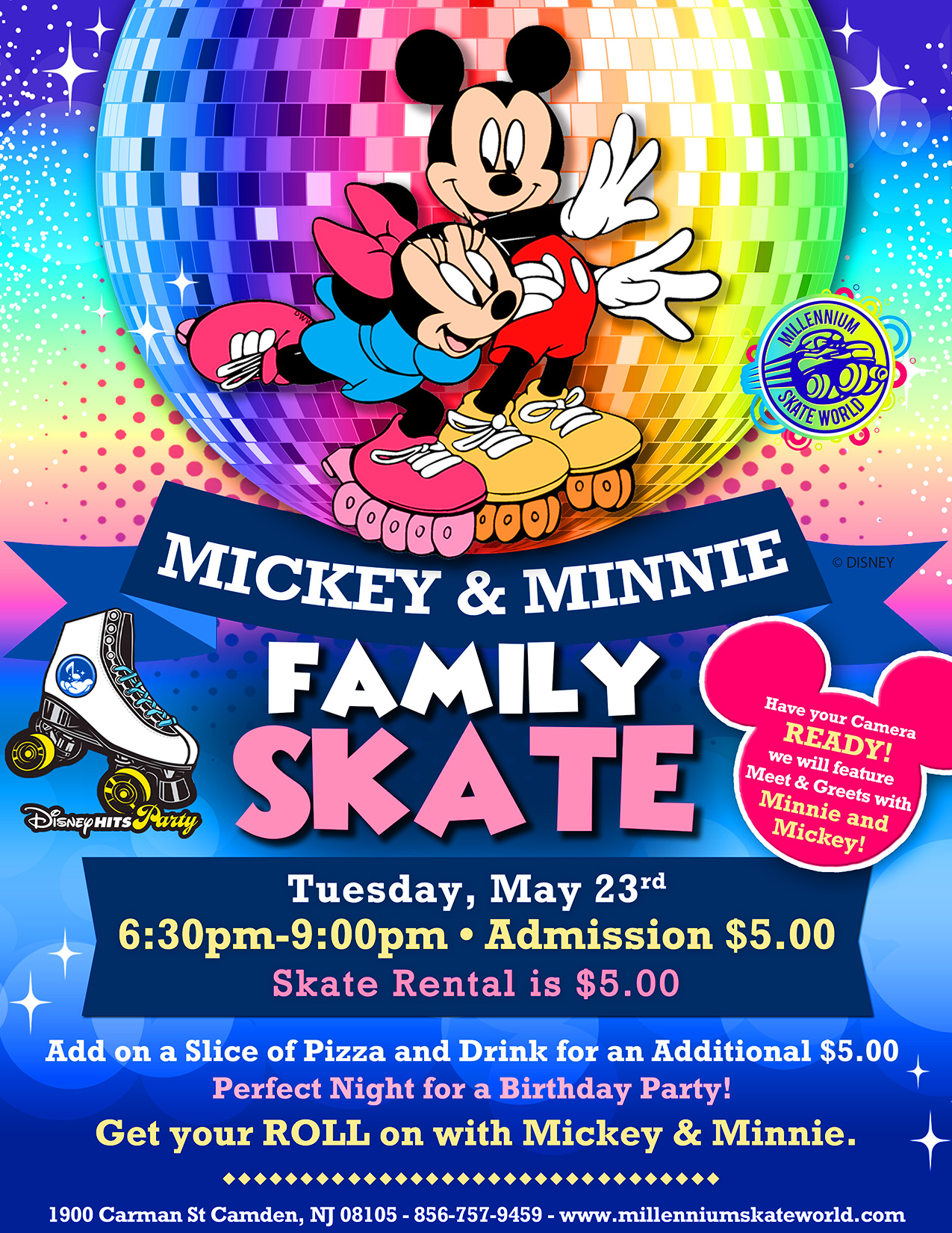 Family Fun Roller Skating 3pm-6:30pm Admission $10.00 Skate rental $5.00 Perfect day or a Birthday party Book a Group of 20 people or more ~~~~~~~~~~~~~~~~ Family package for 4 people $69.99 (4) Admission, (4) Skate rental, (4) Slices of pizza and (4) 8oz drinks