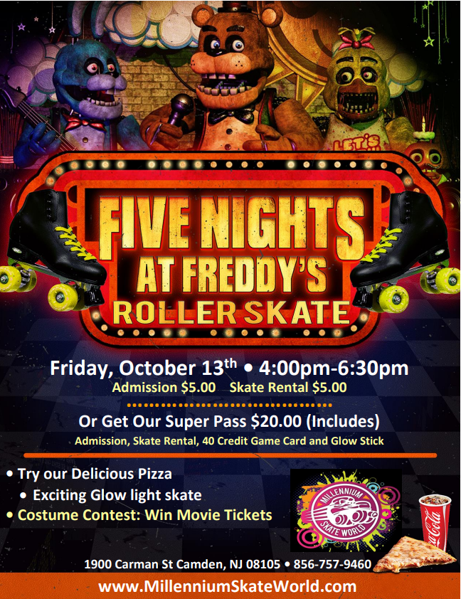 5 Nights at Freddie Family FUN Roller Skating Schedule a Birthday party Perfect day for a Family Get together Admission $5.00 Skate rental $5.00 |