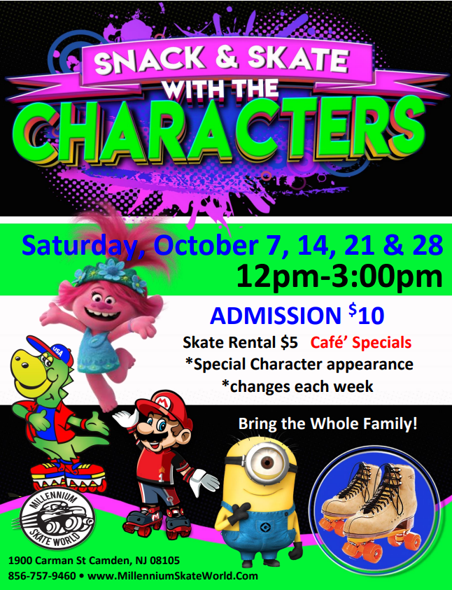 Saturday Family Character Skate 12pm-3pm Book a Birthday party Schedule a Group of 20 people or more $10 Admission $5 Skate rental A different Character appearance will vary each week * No drop-offs, Parents stay with your kids |