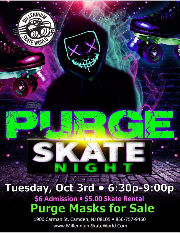 Purge Family FUN Roller Skating Perfect night for a Birthday party ; Call 856-757-9460 Admission $6.00 Skate rental $5.00 Purge Masks for sale plus other Glow products