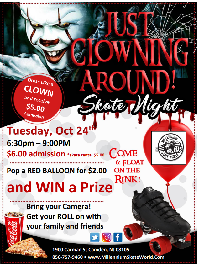 Red Balloon Family FUN Skate Book a Birthday party Meetup with family and friends Admission $6.00 Skate rental $5.00 Pop a Red Balloon for $2.00 and Win a Prize Dress up like a CLOWN and receive $5.00 Admission |