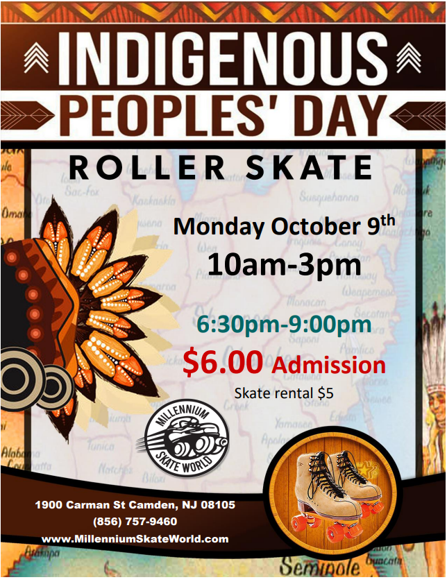 Indigenous People Day Skate Public Skate 10am-3pm and 6:30pm-9pm $6.00 Admission $5.00 Skate rental Cafe Specials Group Discounts