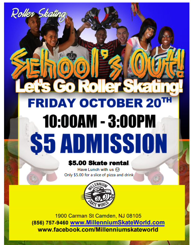 No School - Go Skating Open 10am-3pm We welcome Families, Daycares, Organizations, and more... $5.00 Admission $5.00 Skate rental Add-On: Only $5.00 for 1 Slice of Pizza and Drink |