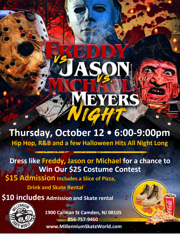 Freddie / Jason / Michael Family Skate Night $10 includes admission and skate rental $15 includes admission, skate rental, 1 slice of pizza and 1 drink Hip Hop, R&B and some Halloween music Dress like Freddy, Jason or Michael for a chance to Win our $25 Costume contest |