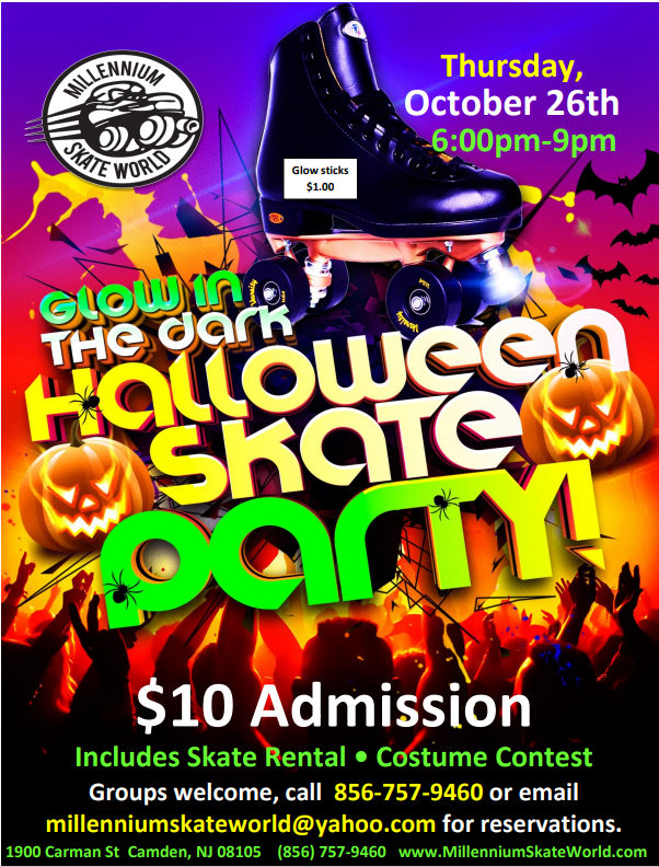 Halloween Family FUN Roller Skating Perfect night for a Birthday party ; Call 856-757-9460 Admission $6.00 Skate rental $5.00 Costume Contest @ 8pm |