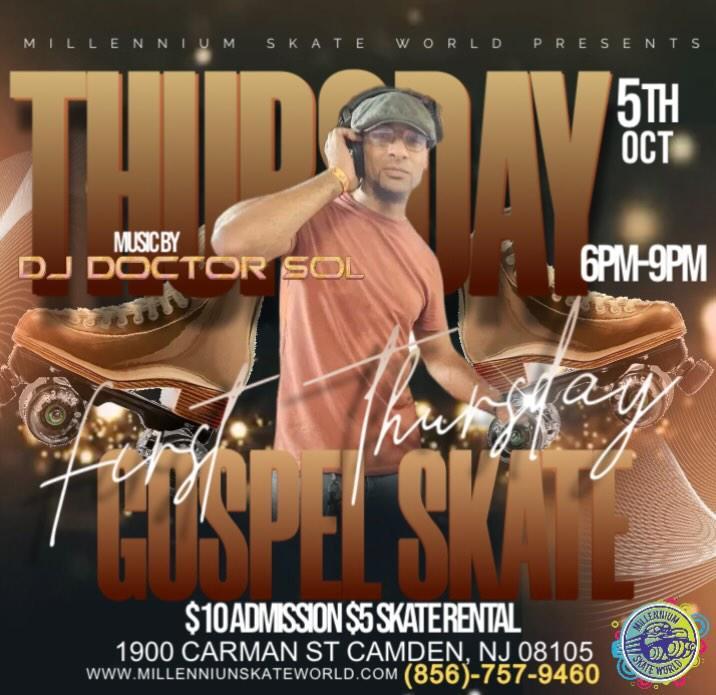 Gospel Family Skate Night Music by DJ Doctor Sol Welcome Church groups *Call 856-757-9460 for discount packages Welcome Praise Dancers Vendors welcome $50 $10.00 Admission $5.00 Skate rental |