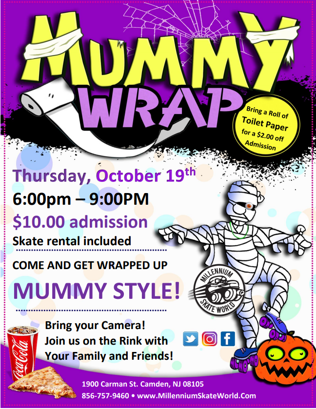 Mummy Wrap Family Skate Night $10 includes admission and skate rental $15 includes admission, skate rental, 1 slice of pizza and 1 drink Wrap a staff member like a Mummy with Toilet Paper Donate a Roll of TP and receive $2 off Admission Parents stay with your kids, No Drop-offs |